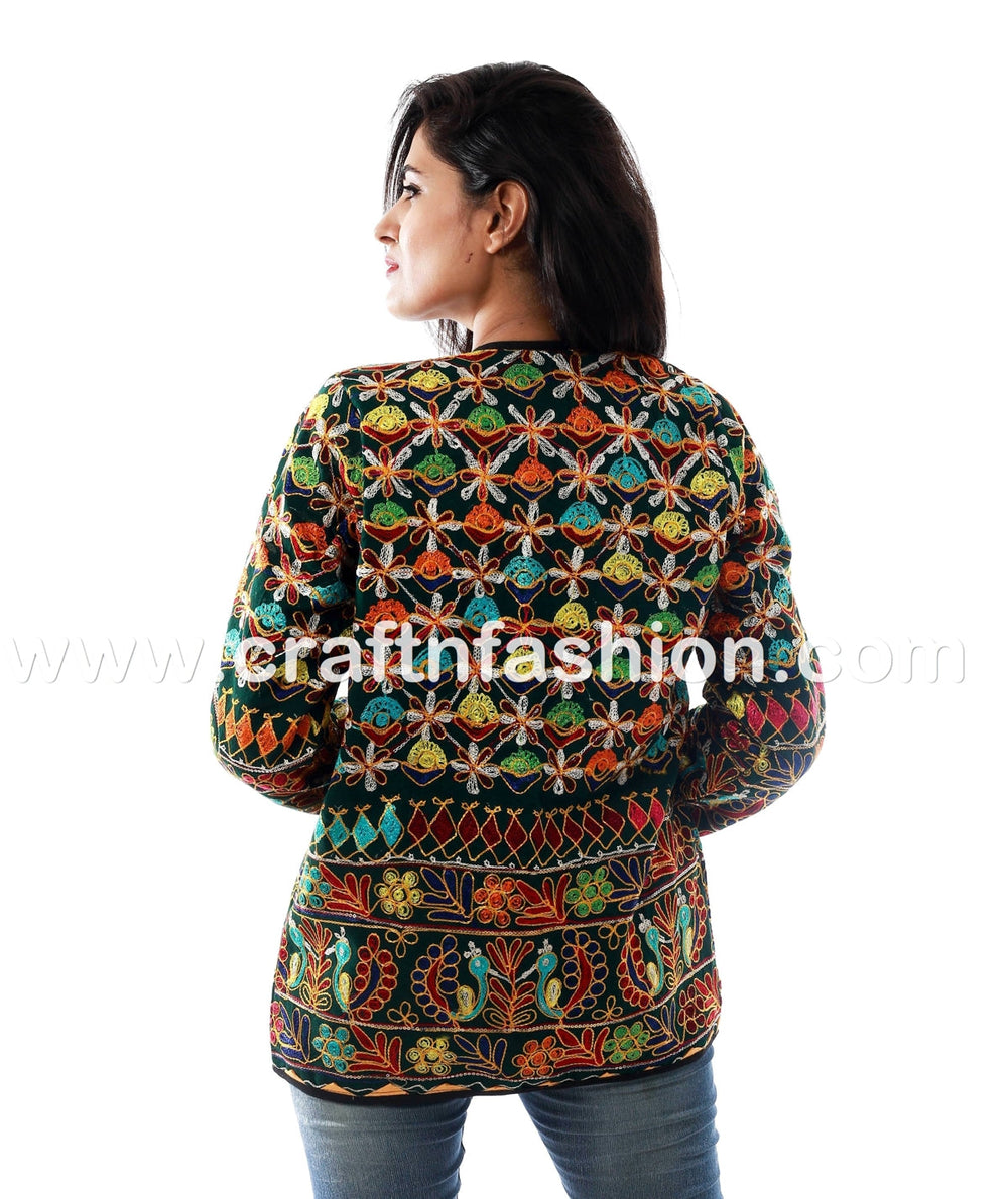 Chaqueta india bordada a mano con espejo hecha a mano por un experto artesano gujarati indio que tiene ambos bordados laterales con un aspecto brillante y llamativo.