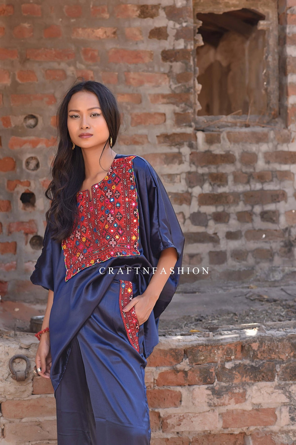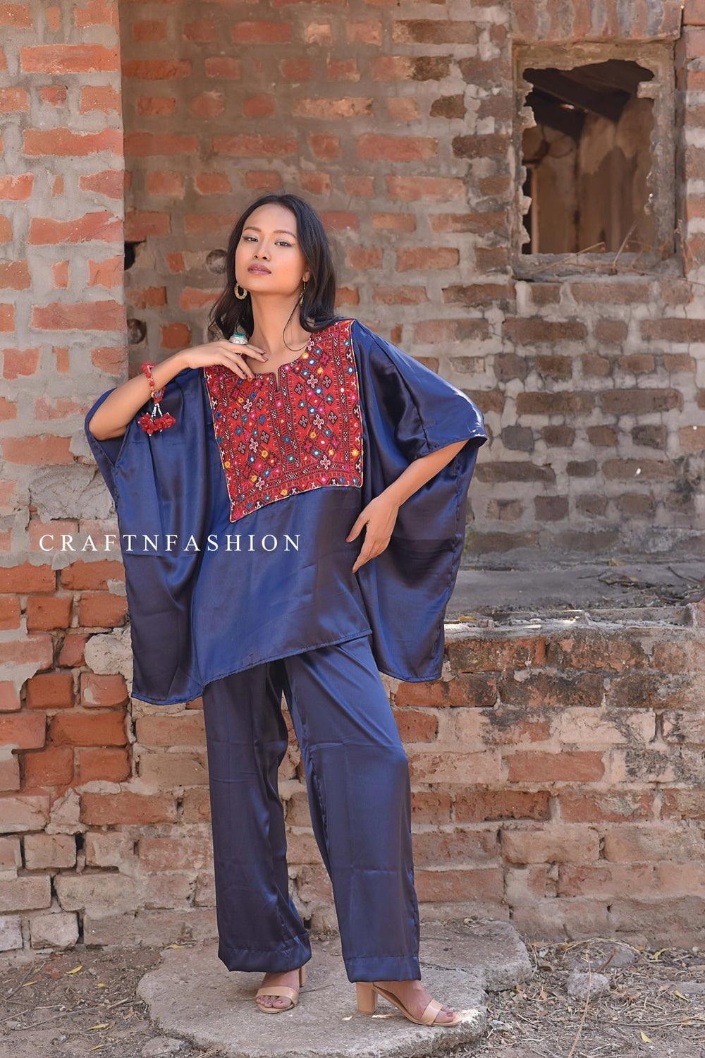 Conjunto de caftán de seda bohemia tradicional exclusivo de diseñador, conjunto de pantalón superior de caftán con yugo de cuello bordado con espejo vintage indio. Ideal para estilo gitano bohemio, ropa de moda bohemia, ropa de festival y ropa de moda.