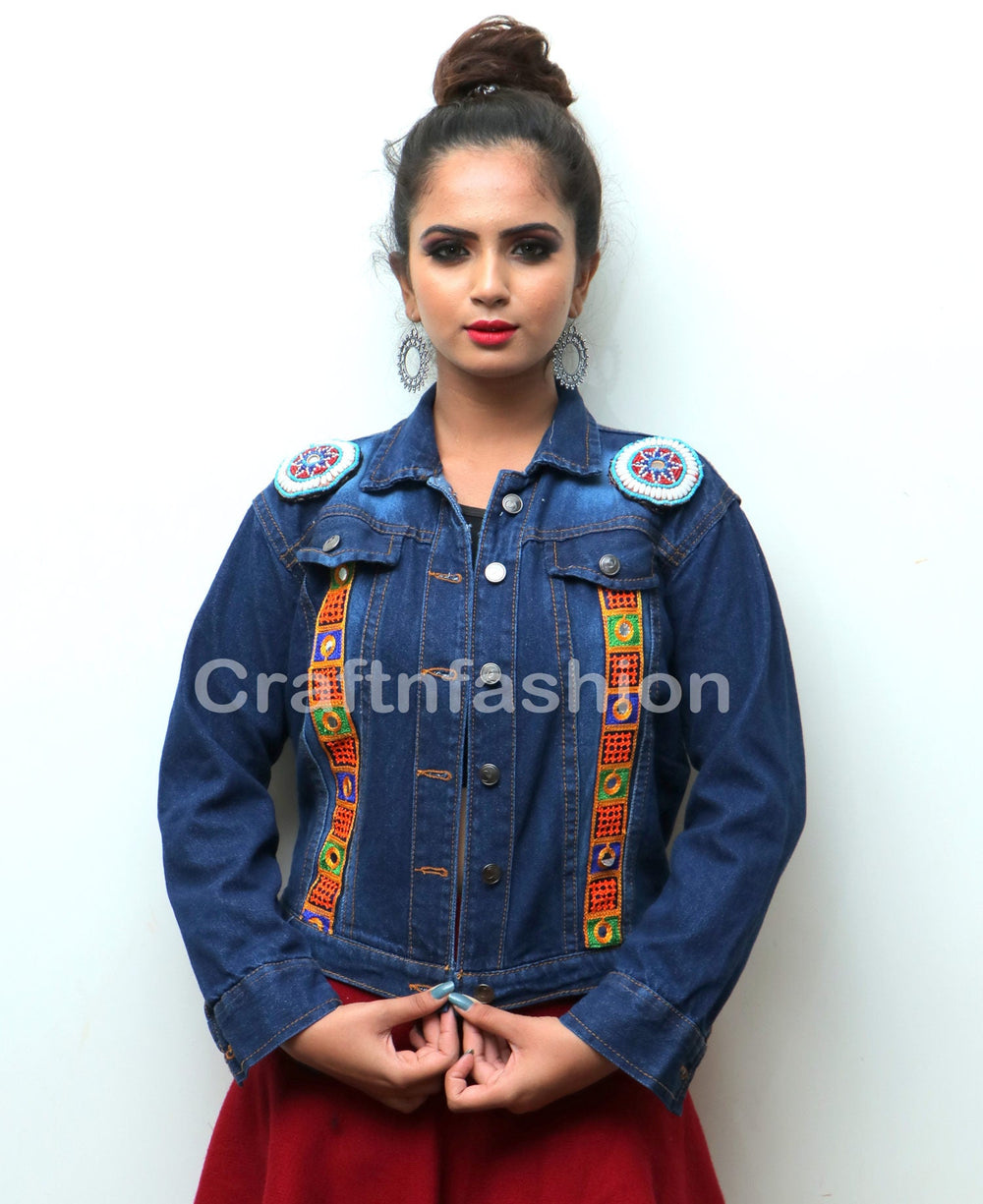 Chaqueta india bordada a mano con espejo hecha a mano por un experto artesano gujarati indio que tiene ambos bordados laterales con un aspecto brillante y llamativo.