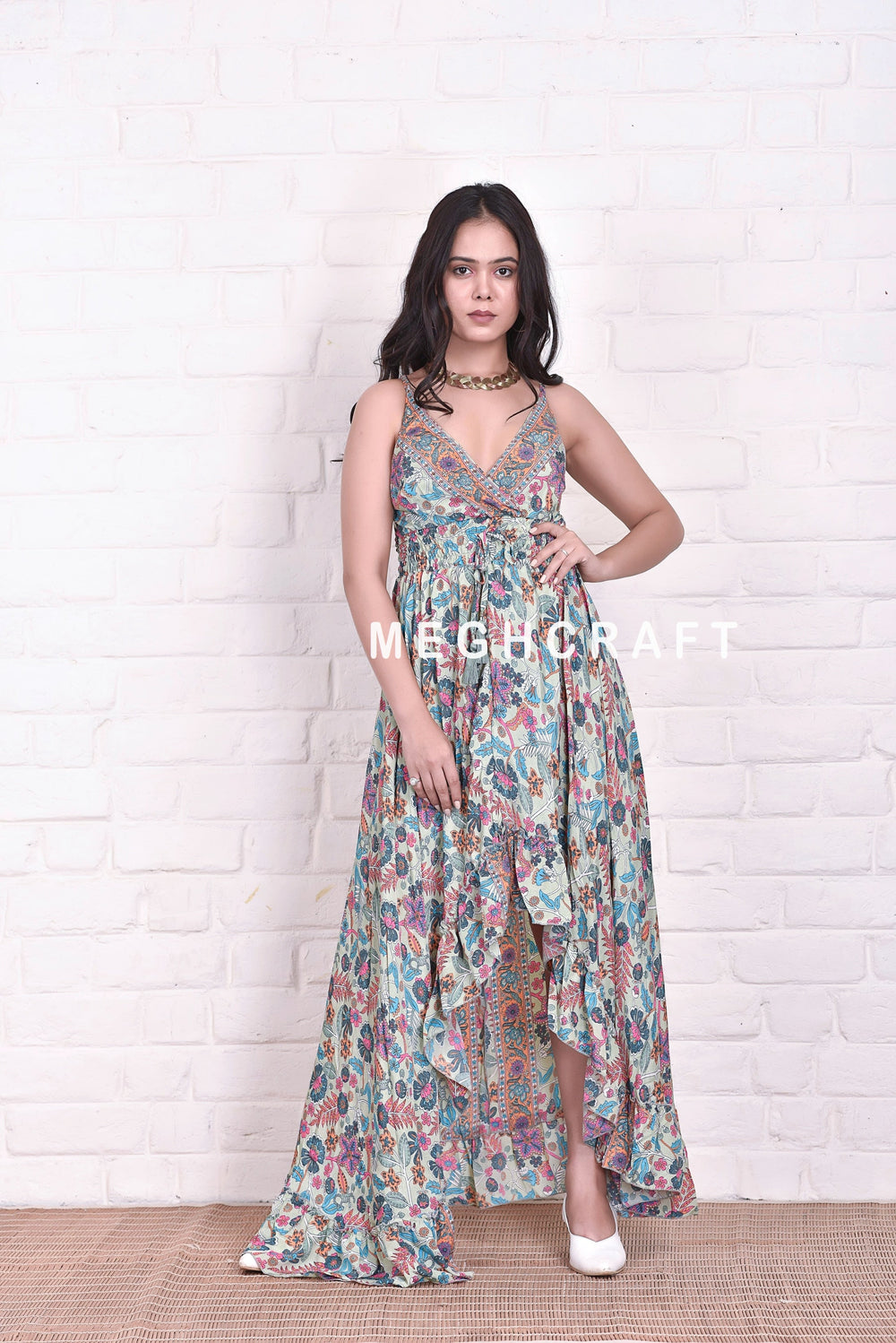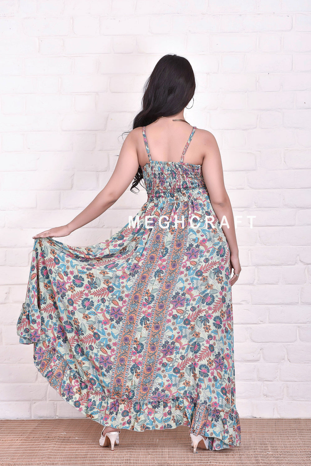 Vestido largo de estilo bohemio alto y bajo de última moda de verano con correa ajustable de espagueti, elástico fruncido en la parte trasera para ajustar el tamaño del busto. El vestido estilo Indo occidental con volantes altos y bajos realzará su belleza de moda de verano.