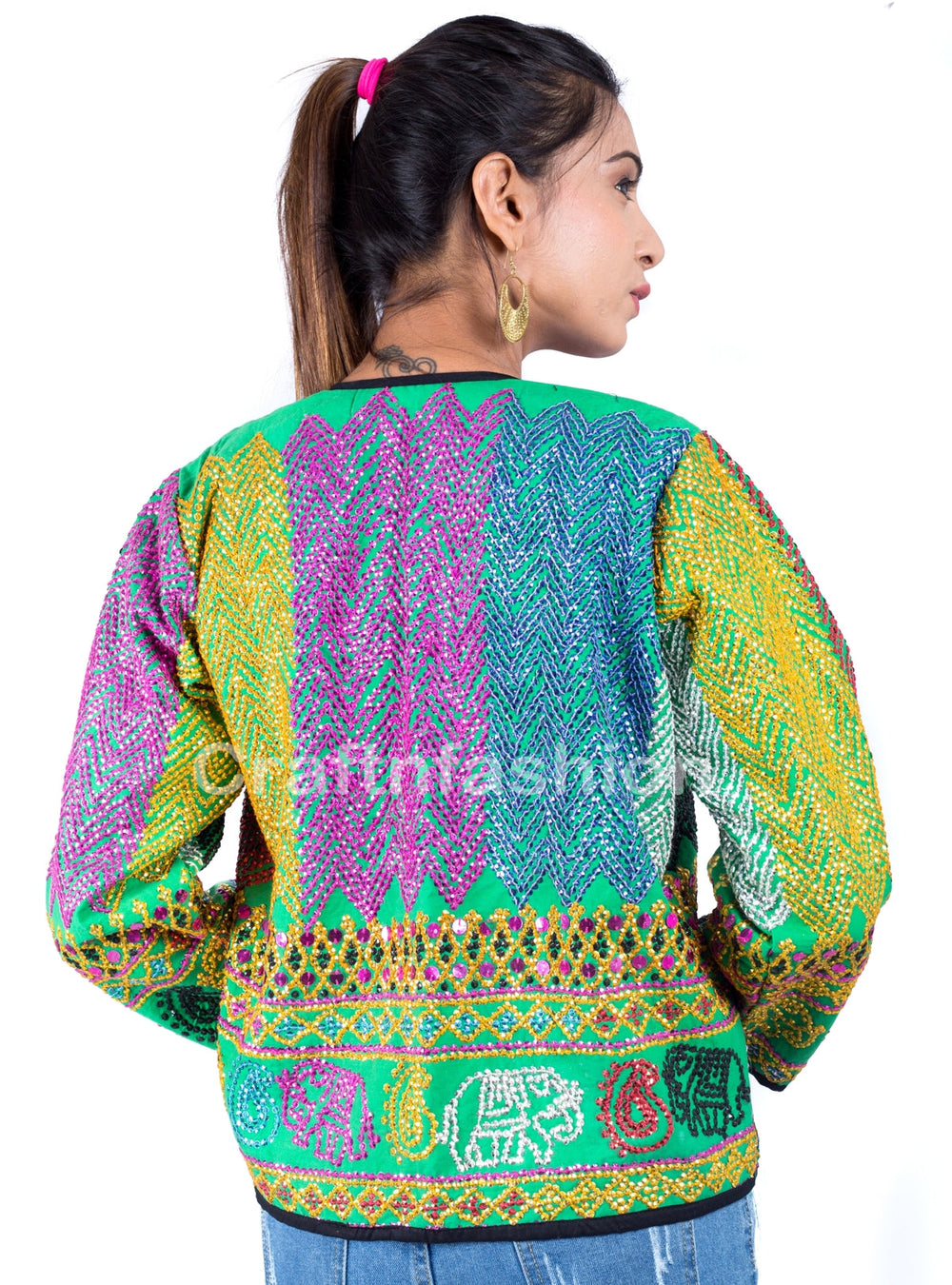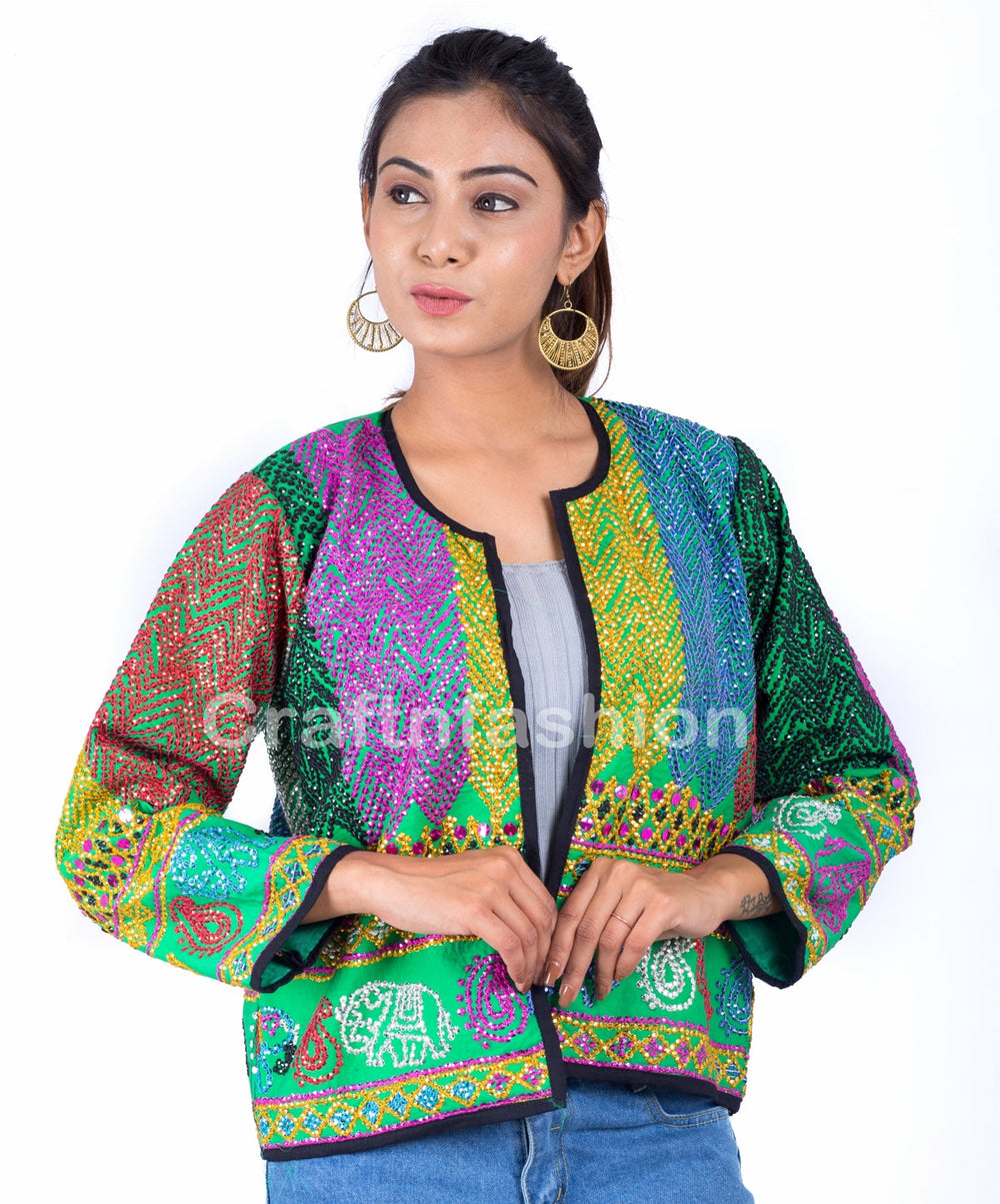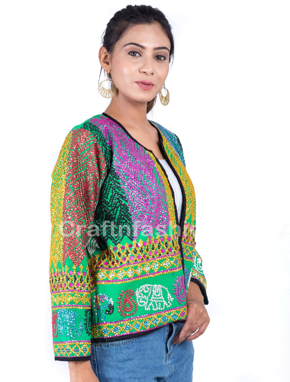 Chaqueta india bordada a mano con espejo hecha a mano por un experto artesano gujarati indio que tiene ambos bordados laterales con un aspecto brillante y llamativo.