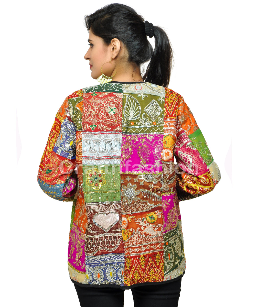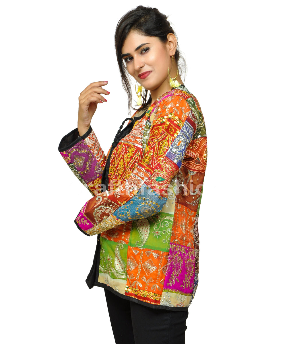 Chaqueta india bordada a mano con espejo hecha a mano por un experto artesano gujarati indio que tiene ambos bordados laterales con un aspecto brillante y llamativo.