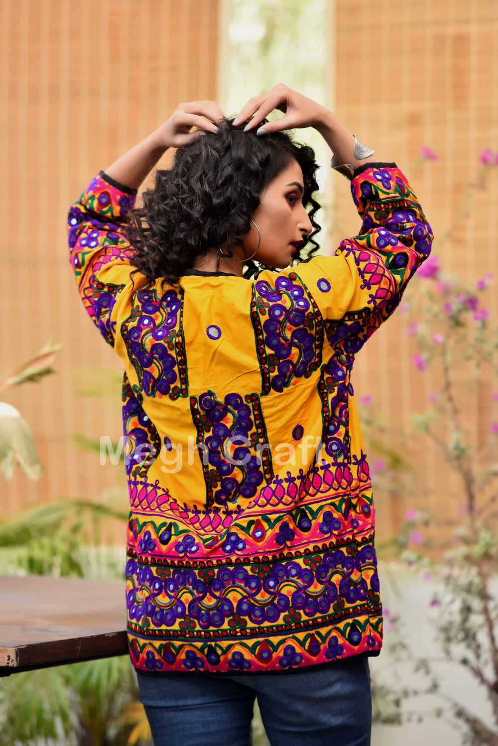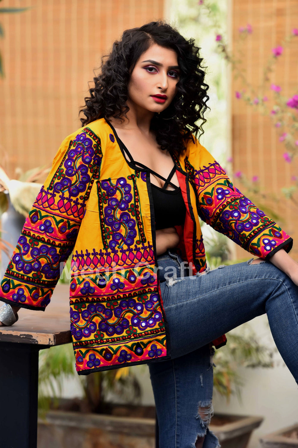 Chaqueta india bordada a mano con espejo hecha a mano por un experto artesano gujarati indio que tiene ambos bordados laterales con un aspecto brillante y llamativo.