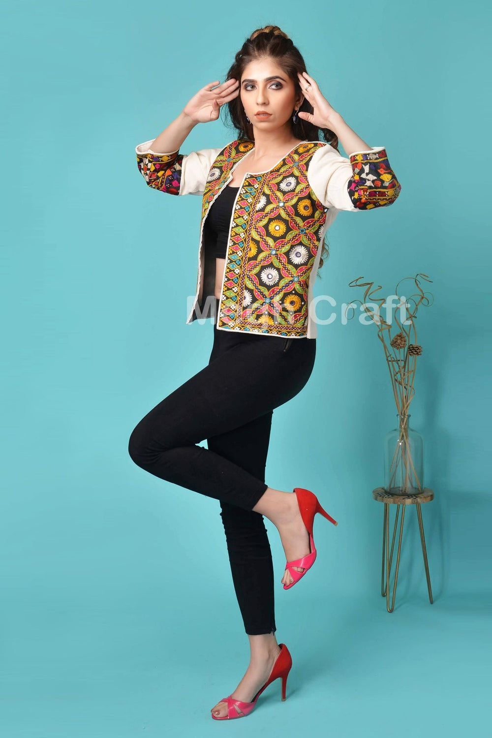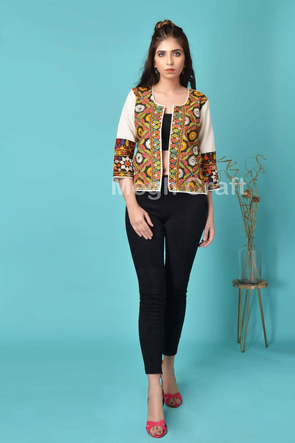 Chaqueta de algodón Kala bordada a mano de Gujarat hecha por expertos artesanos indios gujarati con un aspecto brillante y llamativo. Esta chaqueta tiene un forro interior con estampado de bloques y la parte delantera está decorada con cuentas.