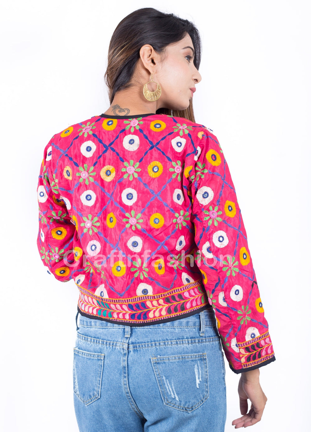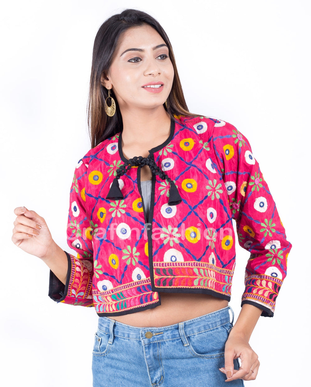 Chaqueta india bordada a mano con espejo hecha a mano por un experto artesano gujarati indio que tiene ambos bordados laterales con un aspecto brillante y llamativo.