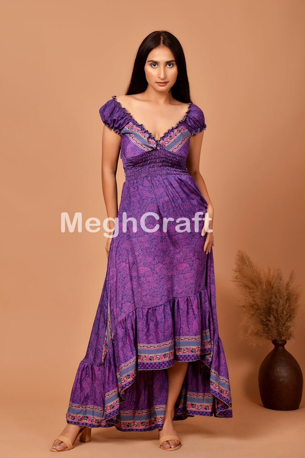 Vestido largo de estilo bohemio alto y bajo de moda de verano de último diseñador. El vestido estilo Indo occidental con volantes altos y bajos realzará su belleza de moda de verano.