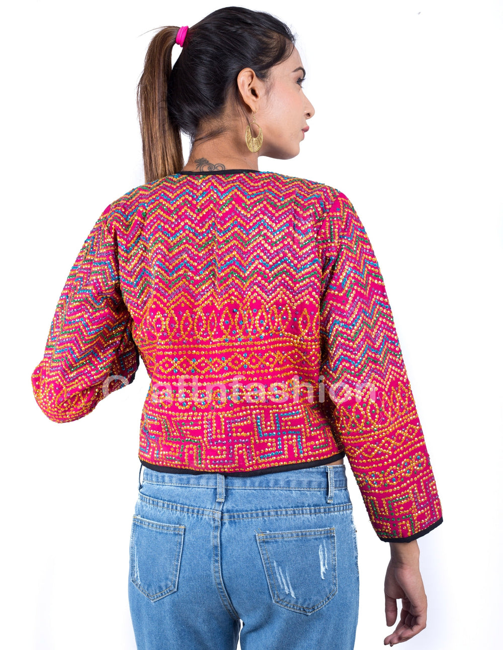 Chaqueta india bordada a mano con espejo hecha a mano por un experto artesano gujarati indio que tiene ambos bordados laterales con un aspecto brillante y llamativo.