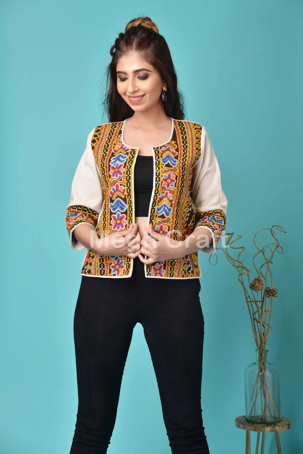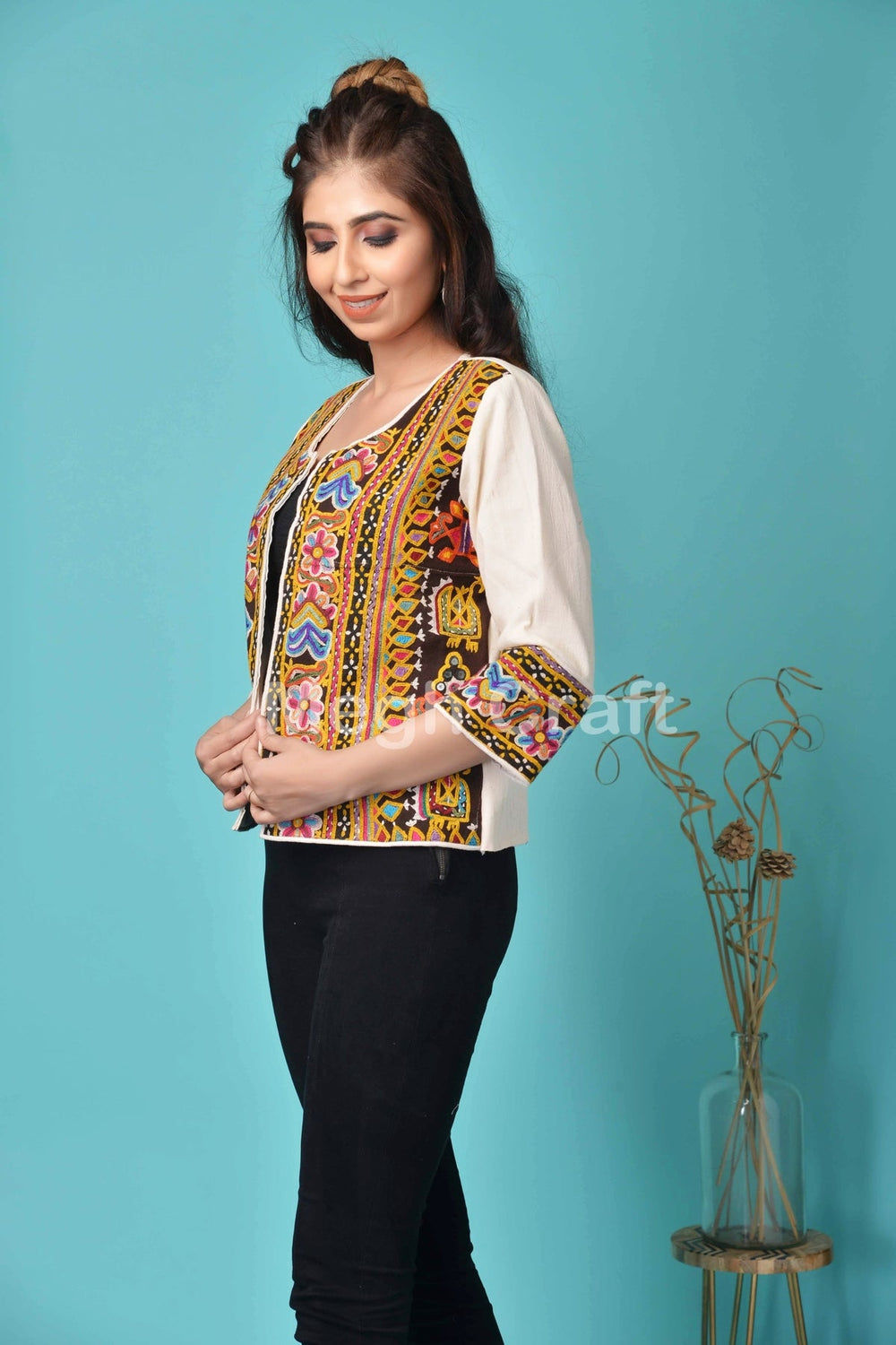 Secuencia de bordado a mano Chaqueta de trabajo Sitara Tikki confeccionada por un experto artesano gujarati indio que tiene ambos trabajos de bordado lateral con un aspecto brillante y llamativo