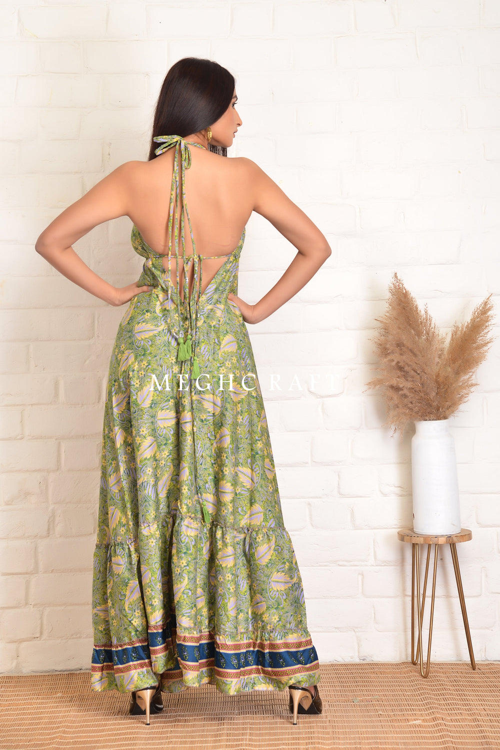 El exclusivo vestido largo con cuello halter para fiesta en la playa bohemio hecho con sari de seda reciclada india de diseñador realzará tu belleza.