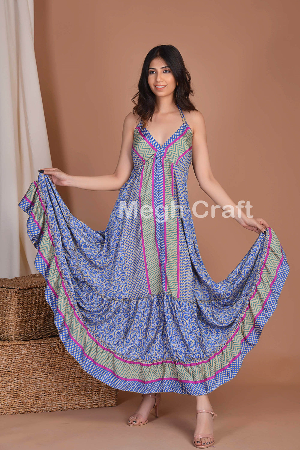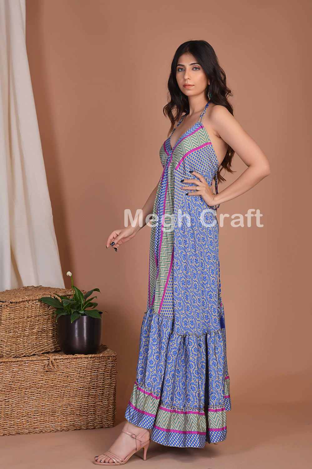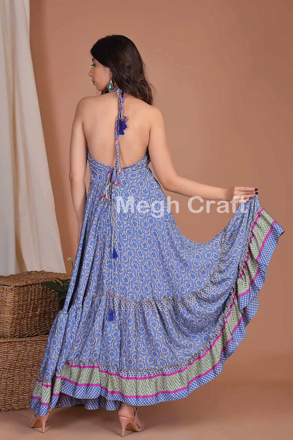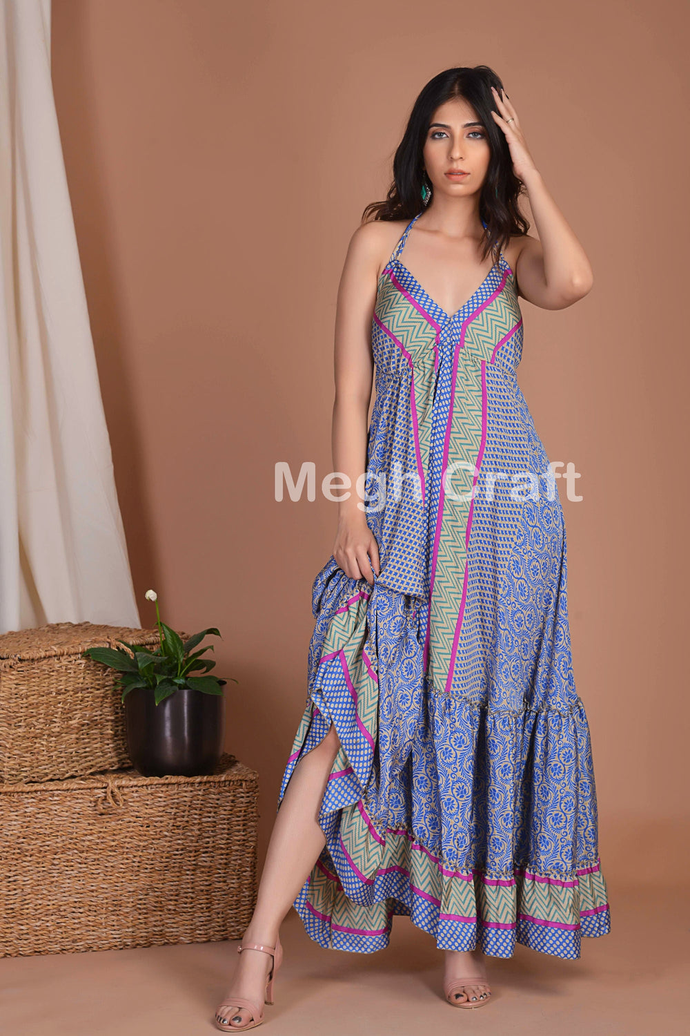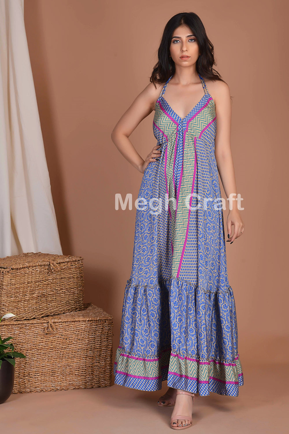 Vestido largo largo con cuello halter y ropa de playa de seda india de diseñador.