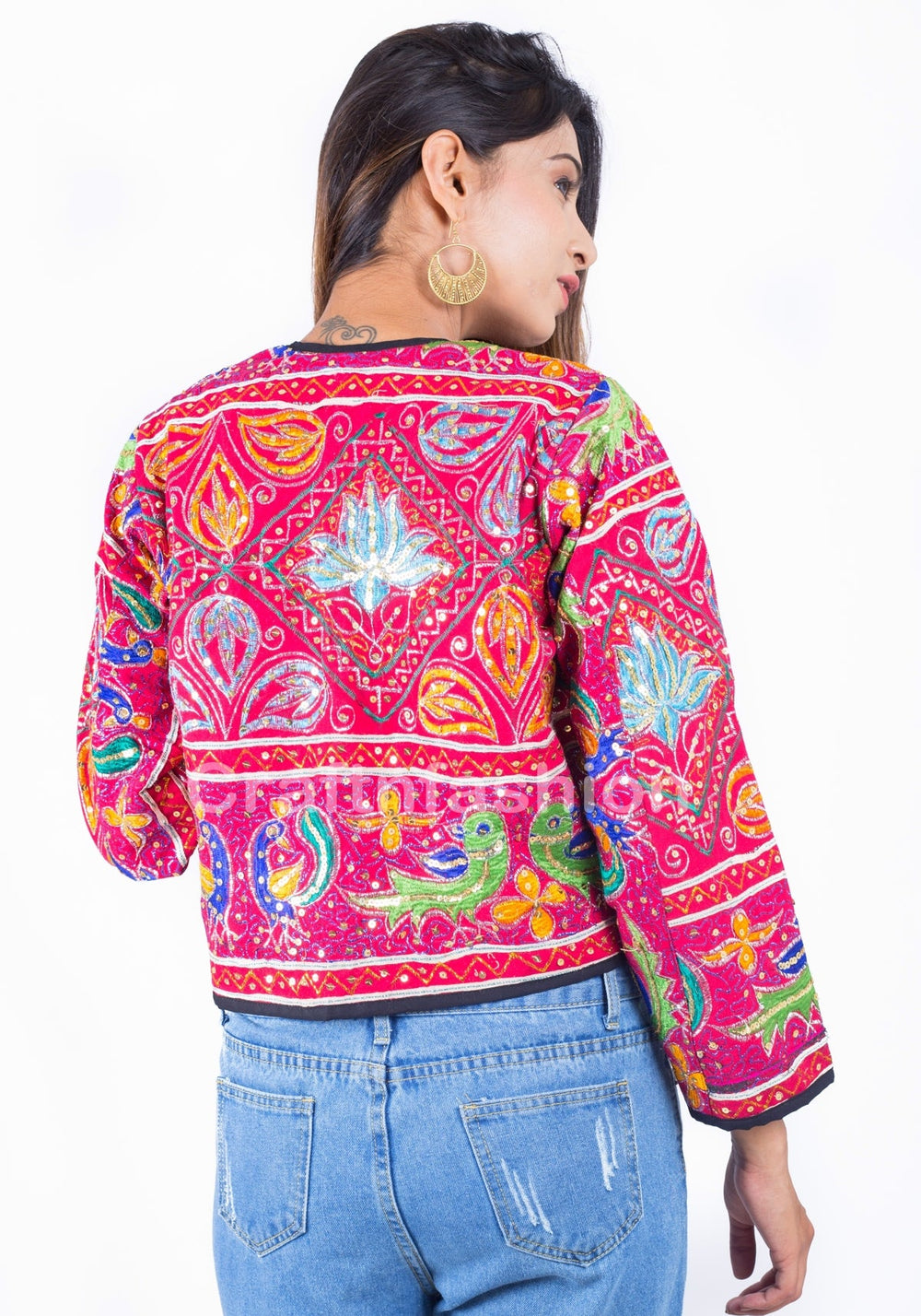 Chaqueta india bordada a mano con espejo hecha a mano por un experto artesano gujarati indio que tiene ambos bordados laterales con un aspecto brillante y llamativo.
