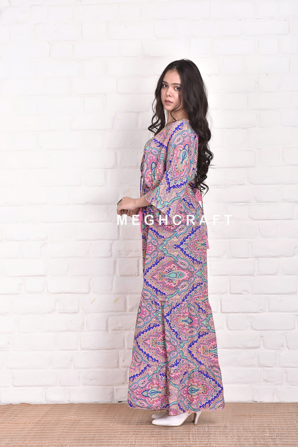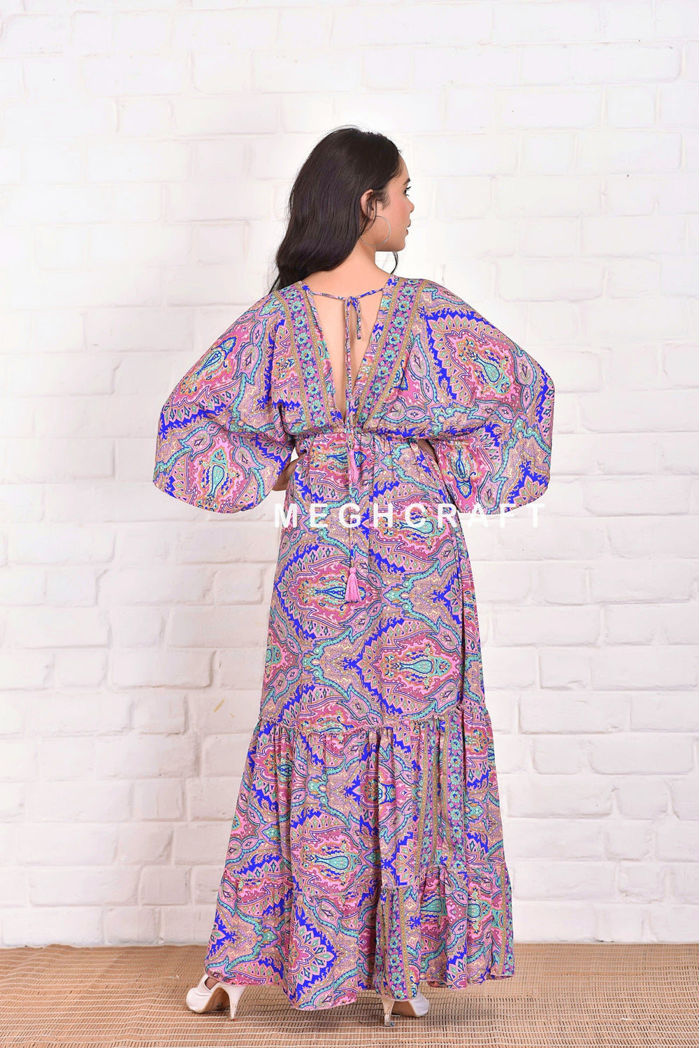 Dernière robe longue de créateur de mode d'été bohème à col en V. Idéal pour la mode estivale, le style bohème, les vêtements de plage, les costumes de danse et le style de la mode urbaine. Fabriqué exclusivement en Inde.