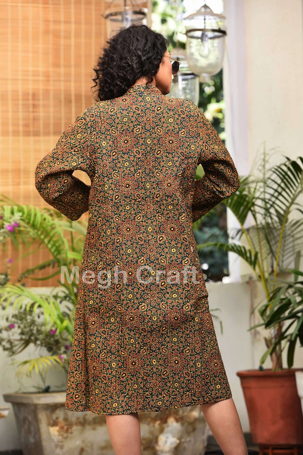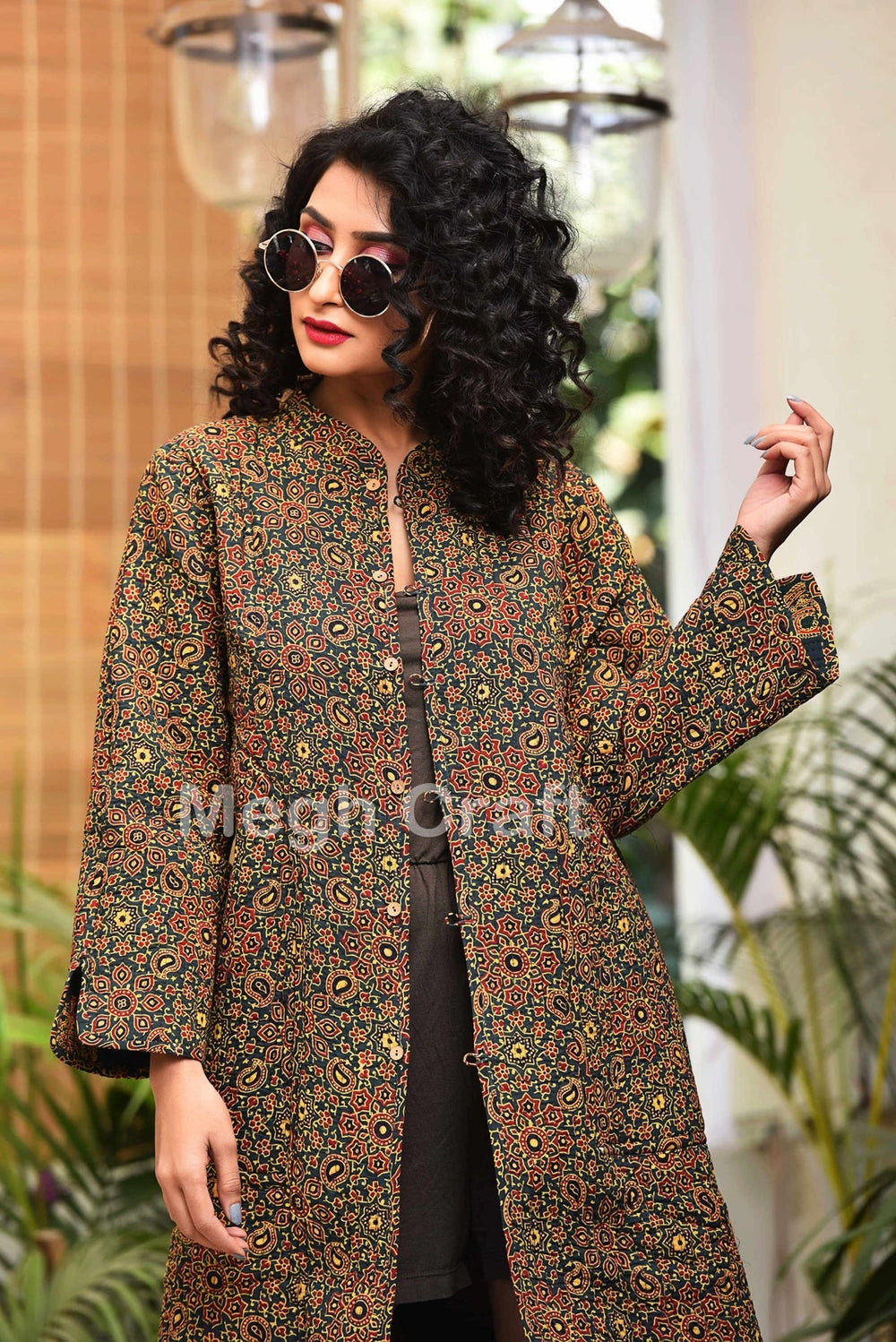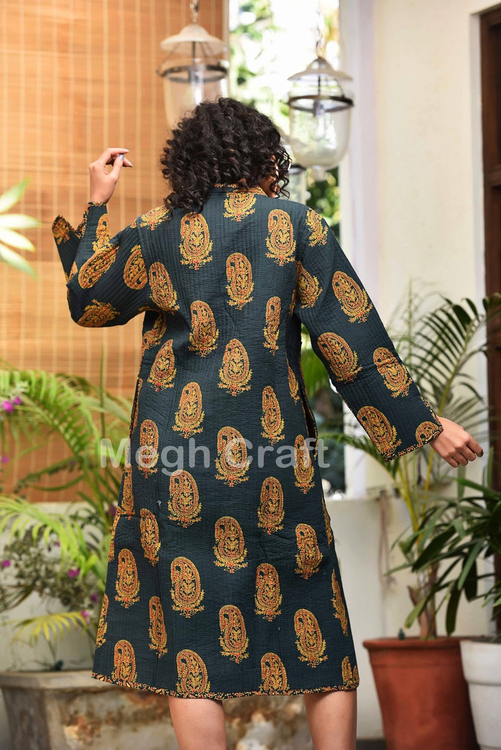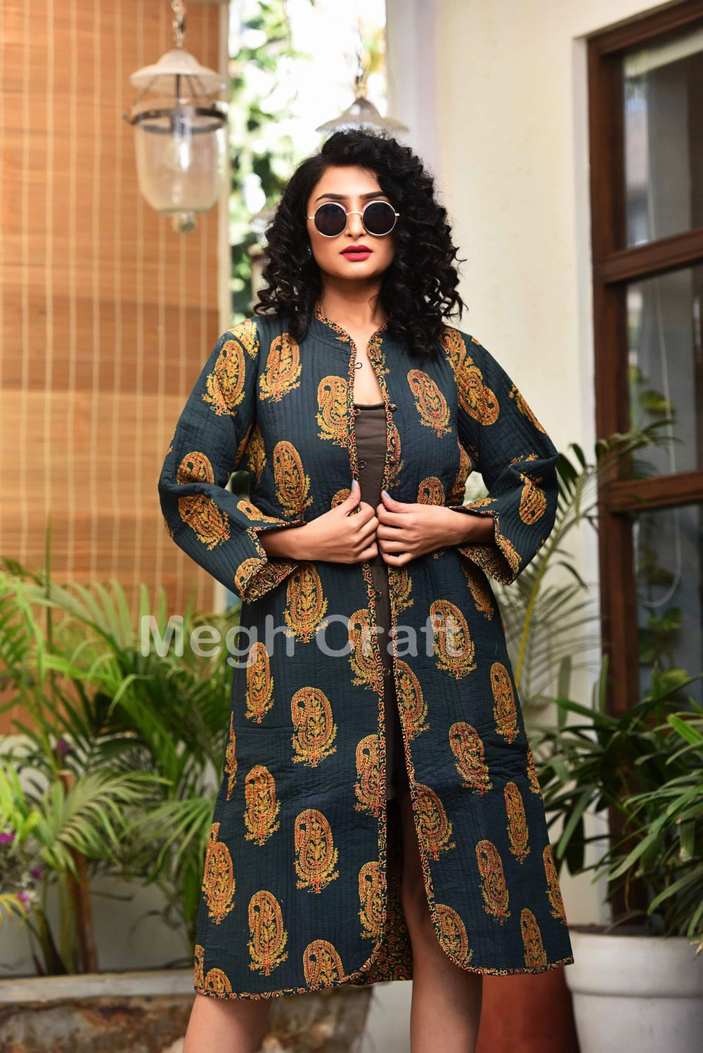 Indian Cotton Blocked Printed Handmade Reversible Quilted Jacket ,Long.