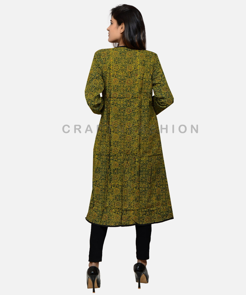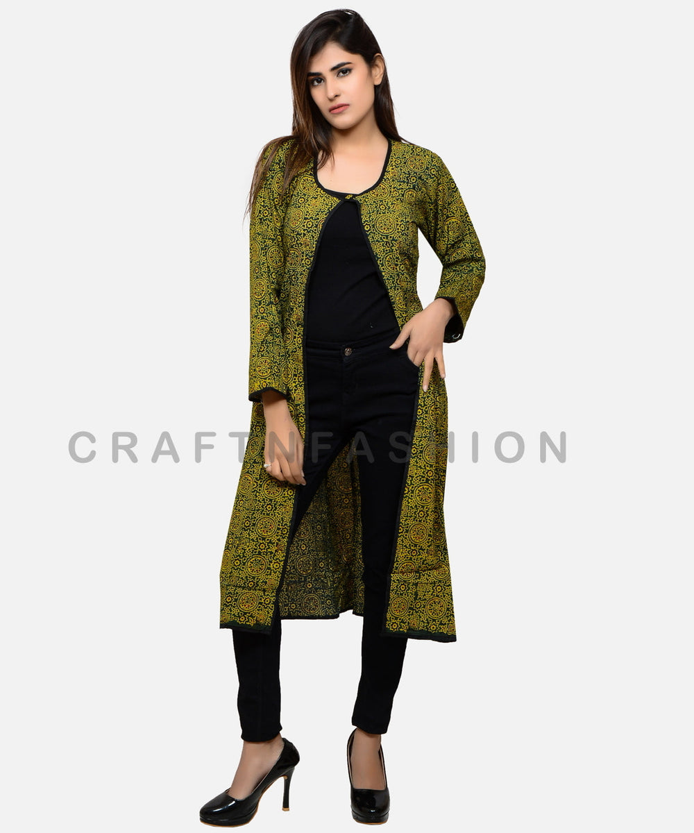 Cotton hand bloack Printed Ajrakh / Gamthi Print Long Shrug, jacket. Best Suitable for Formal wear, Everyday Wear, Summer Fashion, Boho Fashion.