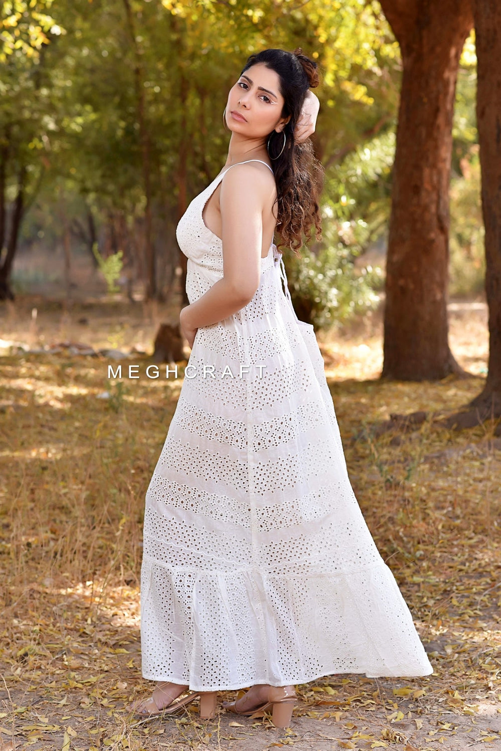 Designer Schiffli Embroidered Cutwork Midi Dress. Best Suitable for summer wear ,beach wear ,wedding wear, bridesmaid's dresses & fashion wear.