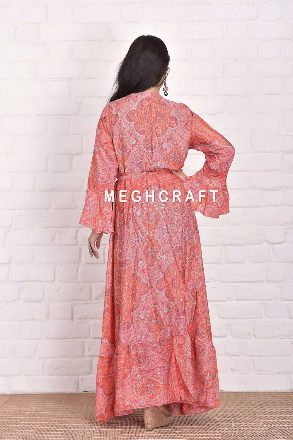 Bohemian Silk Wrap Kimono Dress Bell Sleeve. Long Length, Loose Fit, Soft & Comfy.