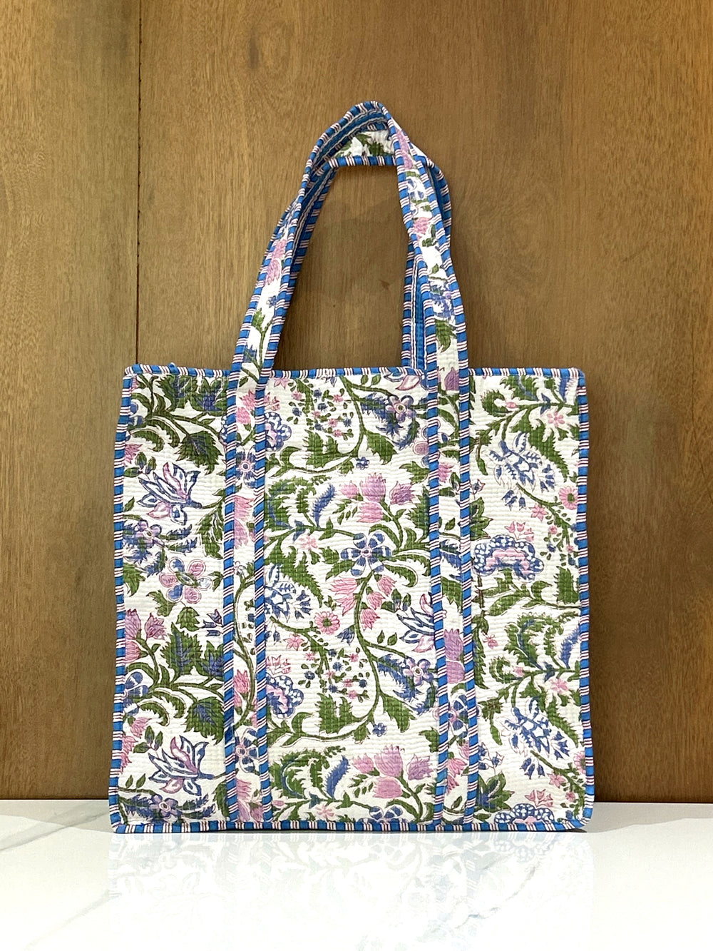 Perfect for a market tote, beach bag, weekender Bag, Shopping bags and much more! Our quilted totes are handmade by Indian artisans, so there may be some irregularities, and the print placement may vary by bag.