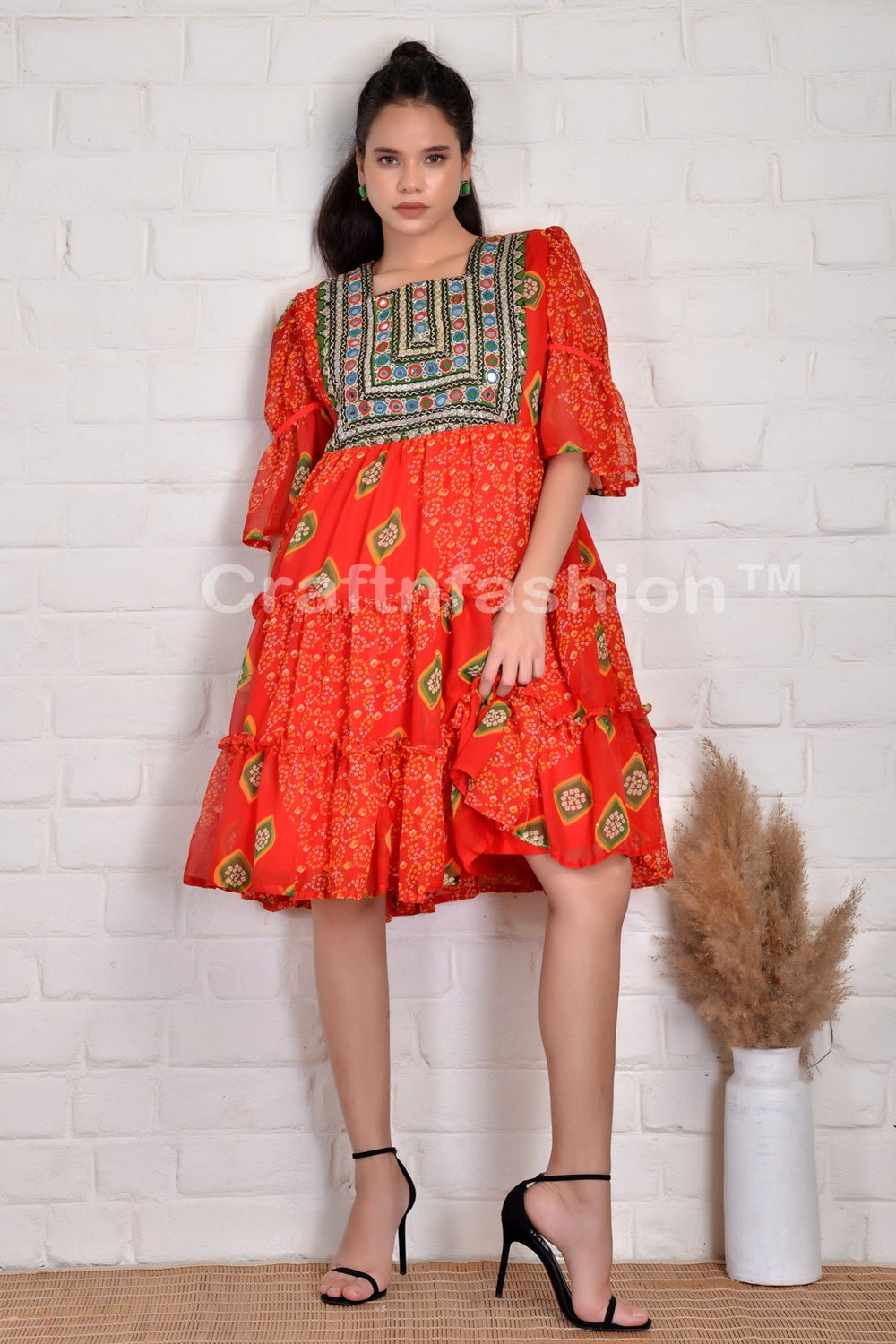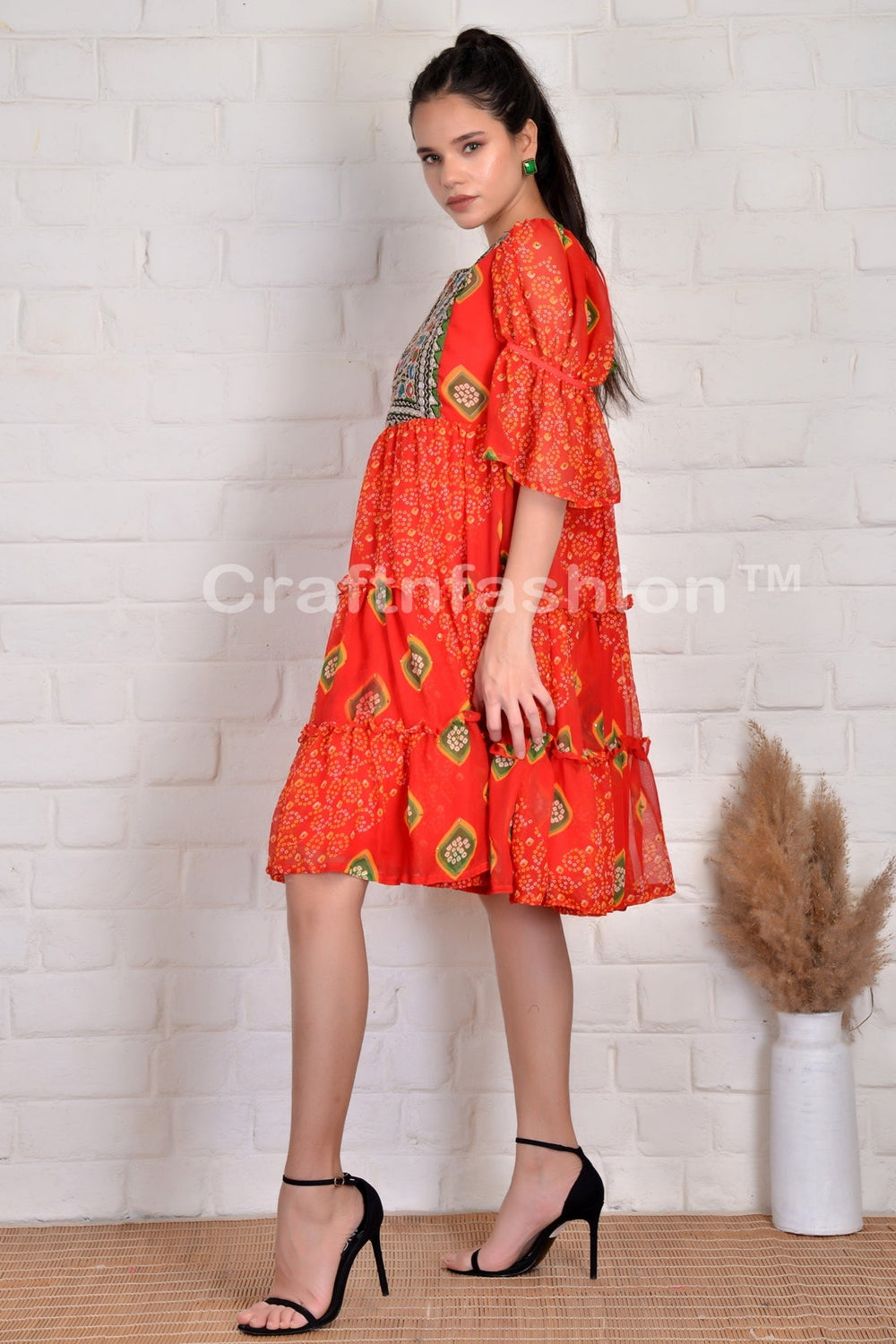 Designer Embroidery patch work Bandhni / Bandhej Chiffon Ruffle style dress Tunic Top Dress. Suitable For Beach Wear, Summer Wear, Resort Wear, Fashion Wear