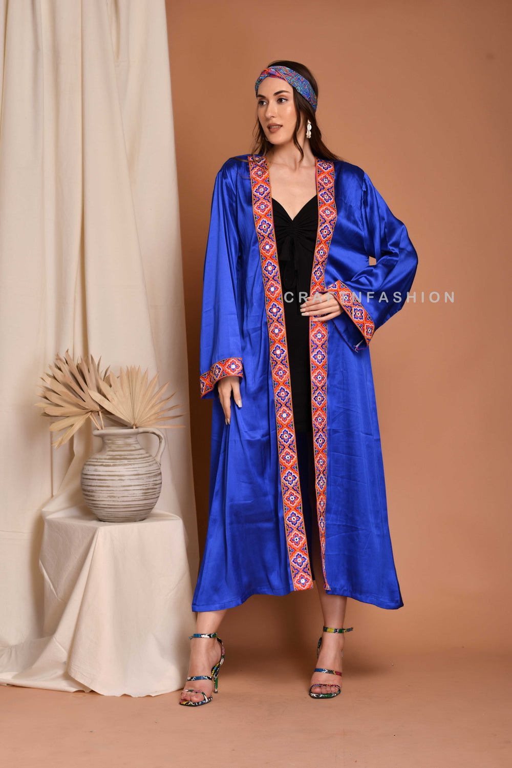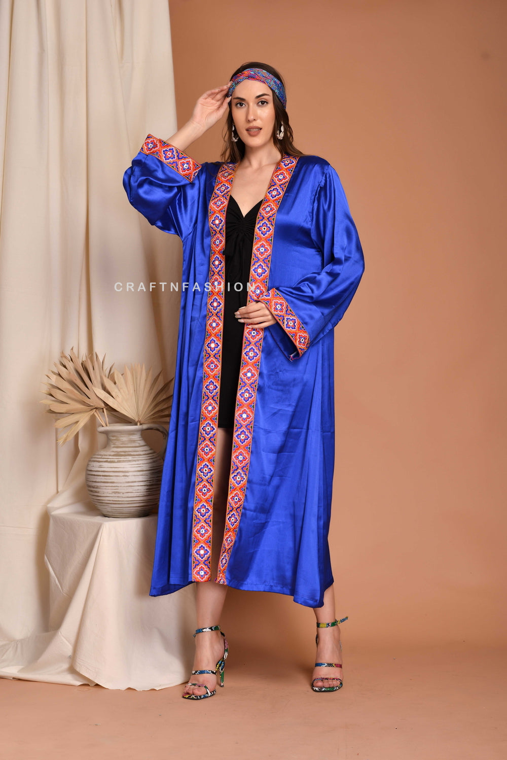 Designer Satin Kimono. Boho Fashion Kimono with Thread Embroidered border.