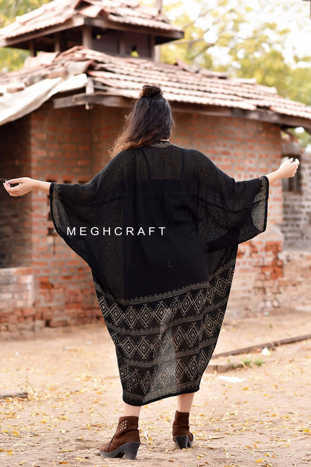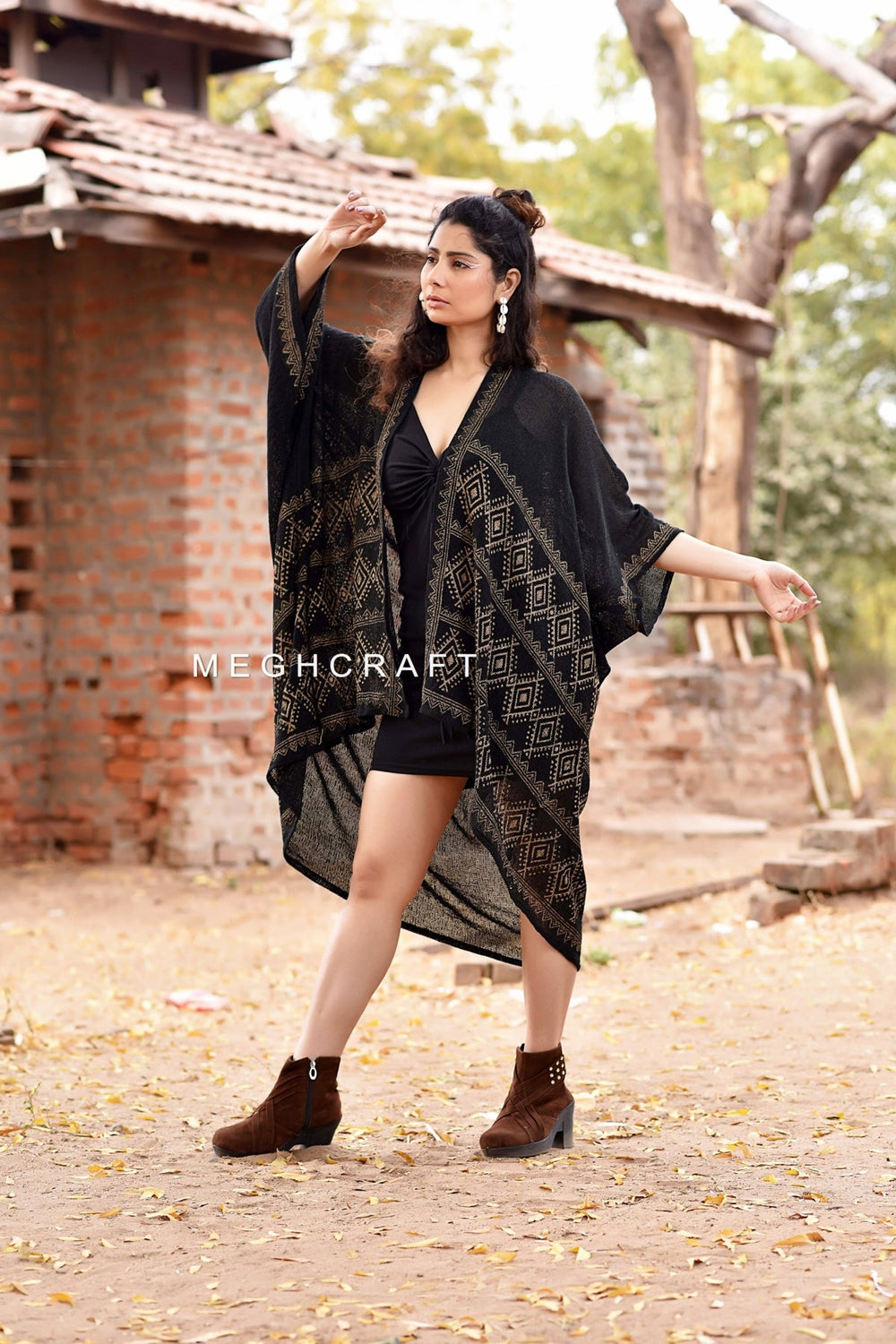Indian Hemp Cotton Free Size Poncho With Block Printed Border. New Designer hemp Cotton Block Printed Poncho For Women