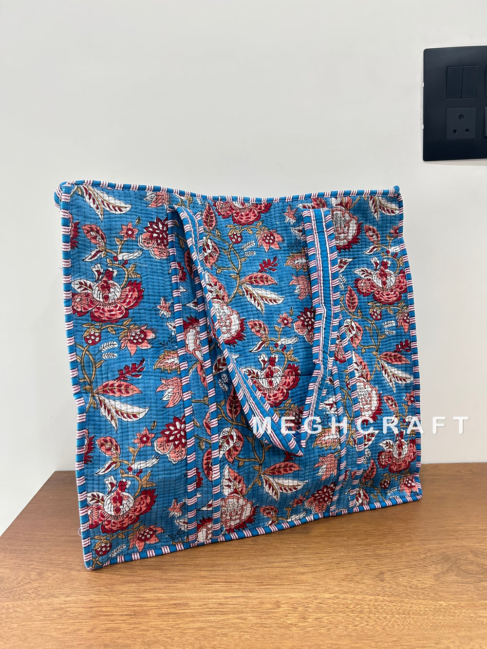 Elevate your style with this stunning Designer Floral Print Cotton Quilted Tote Bag. Handcrafted Indian cotton block-printed quilted tote bag with Zip closure, perfect for shopping, travel, or daily use. Features traditional patterns, durable and comfortable shoulder straps.