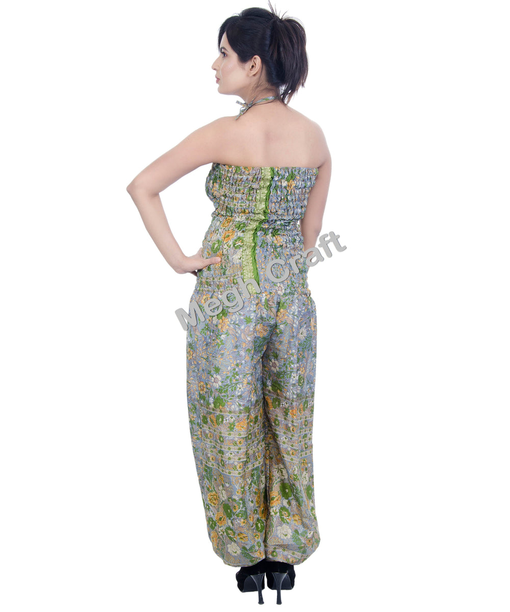 Designer Summer fashion wear Recycled Vintage Silk Sari Halter Neck Women jumpsuit , Smocked Jumpsuit.