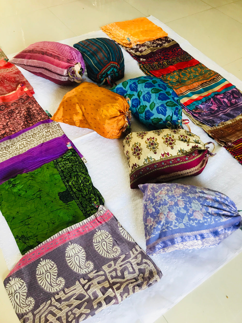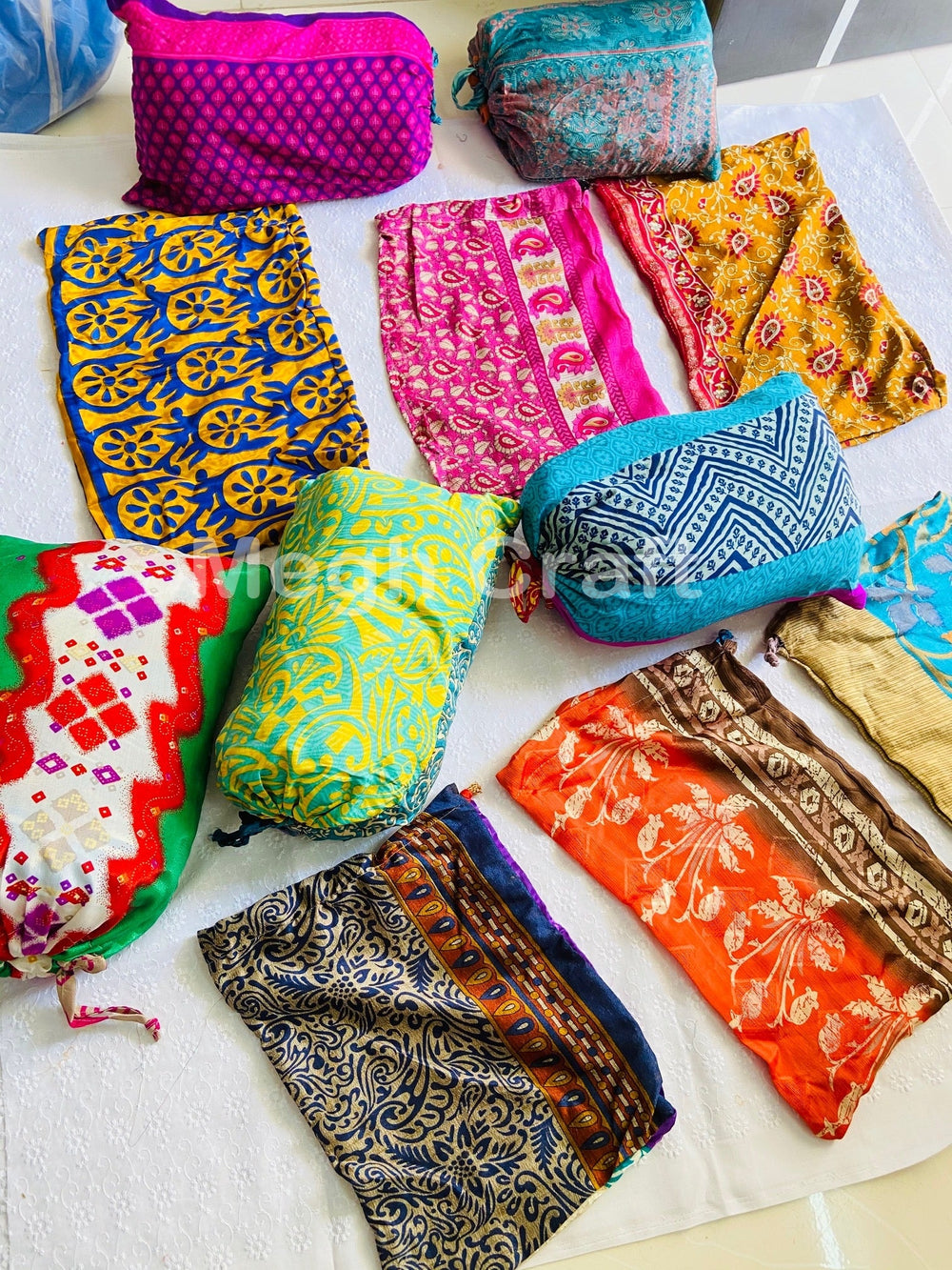 It will be comes in a mix lot of assorted Prints , colors and sizes. It is made from recycled cut pieces of poly crepe silk vintage saree.