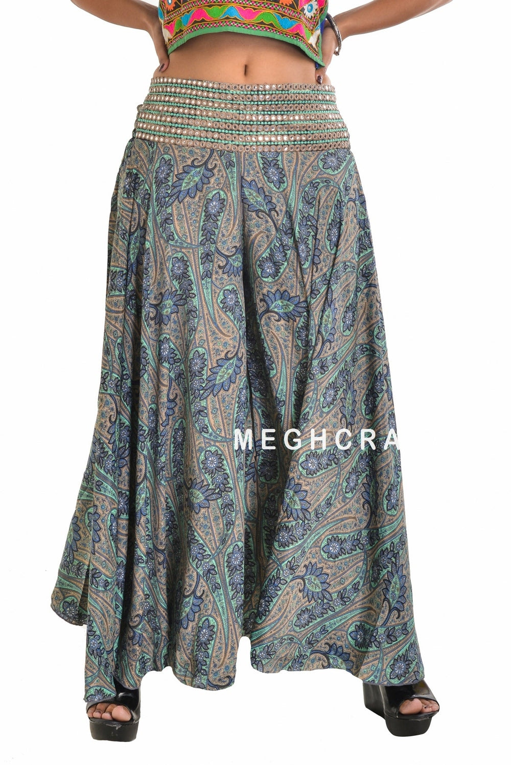 Indian Vintage Recycled Silk Wide leg Trouser Palazzo Pant ,Front Embroidered Synthetic Mirror Work Belt with Back Side Smocked Elastic Waist.