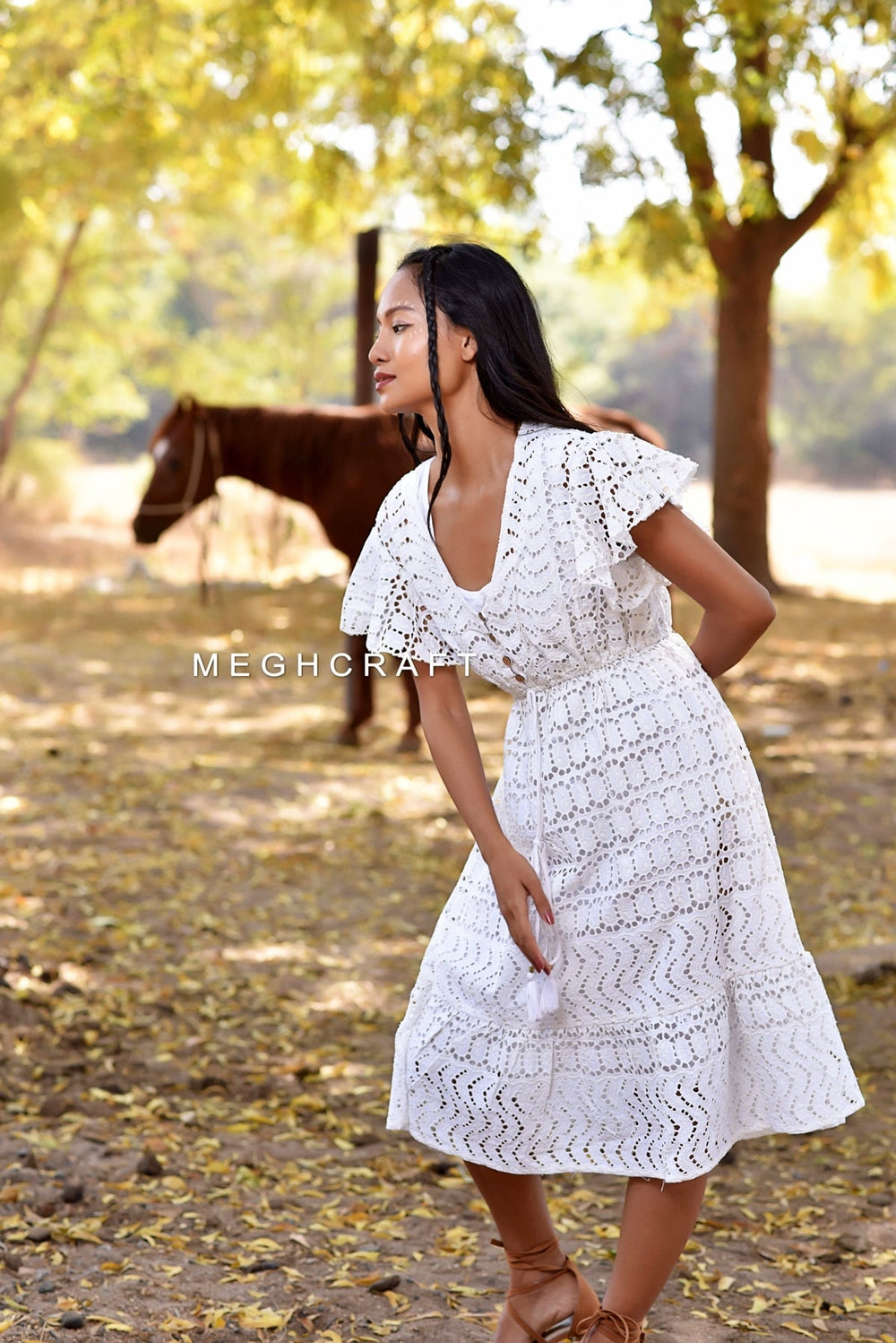 Designer Schiffli Embroidered Cutwork Midi Dress. Best Suitable for summer wear ,beach wear ,wedding wear, bridesmaid's dresses & fashion wear.