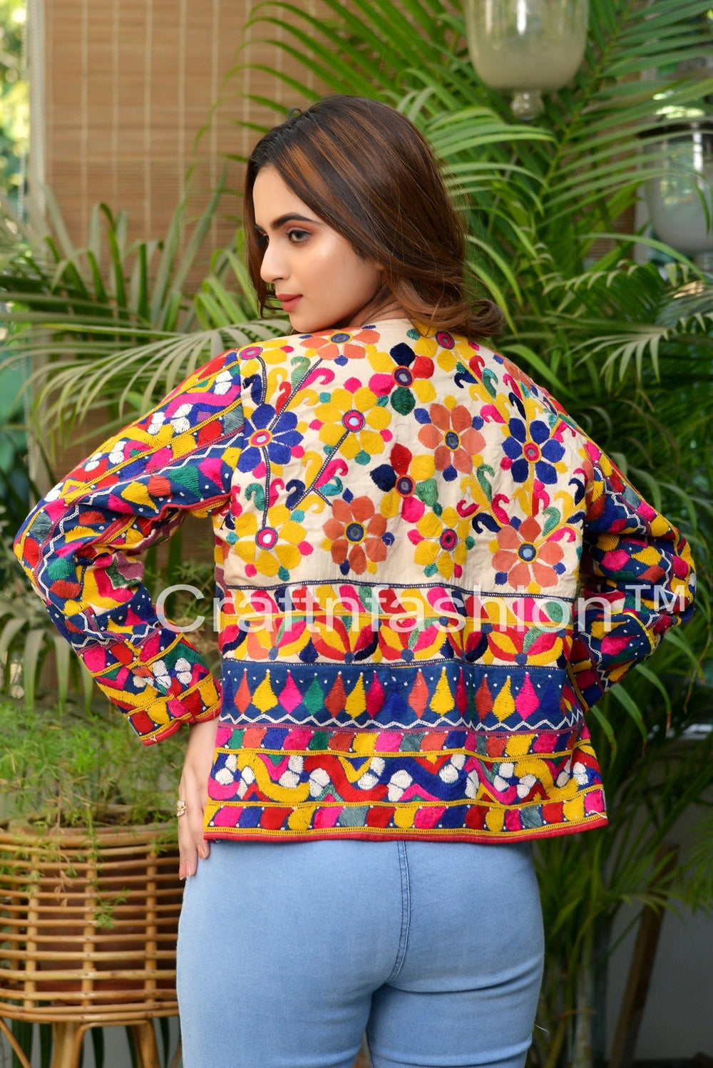 It is made from Gujarati Vintage Kutch Tribal Nomadic fabric. We make our all-Bohemian Banjara Jackets from very well collectible vintage fabric which will take 2-3 months to finish it by Gujarati Trible Ladies. This Banjara Style hand embroidered long jacket is one of kind piece which is rarely available. Best Suitable for Boho Fashion, Gothic look, Bohemian Style, fusion wear & gypsy fashion wear.