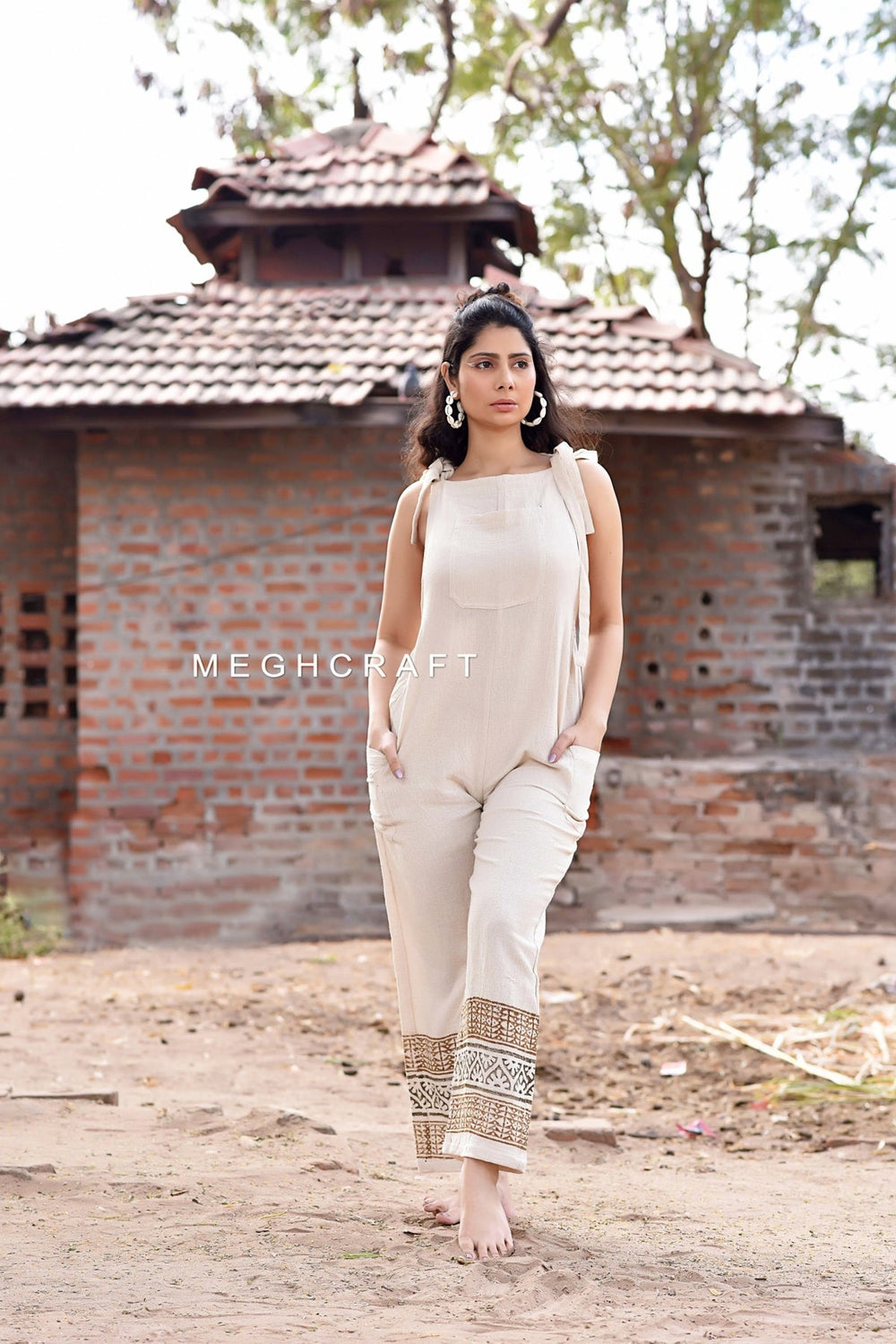 This Jumpsuit has been hand printed with an old technique using wood blocks and natural dye colors. An Elegant Border Is Printed By Hand Using The Block Print Technique. Ancestral Technique which Consists of Applying a Stamp to the Fabric which has been Dipped in the Dye beforehand and Repeating the Action Several Times Until Covering the entire Border. The Wooden Block is Himself Sculptor by Hand.