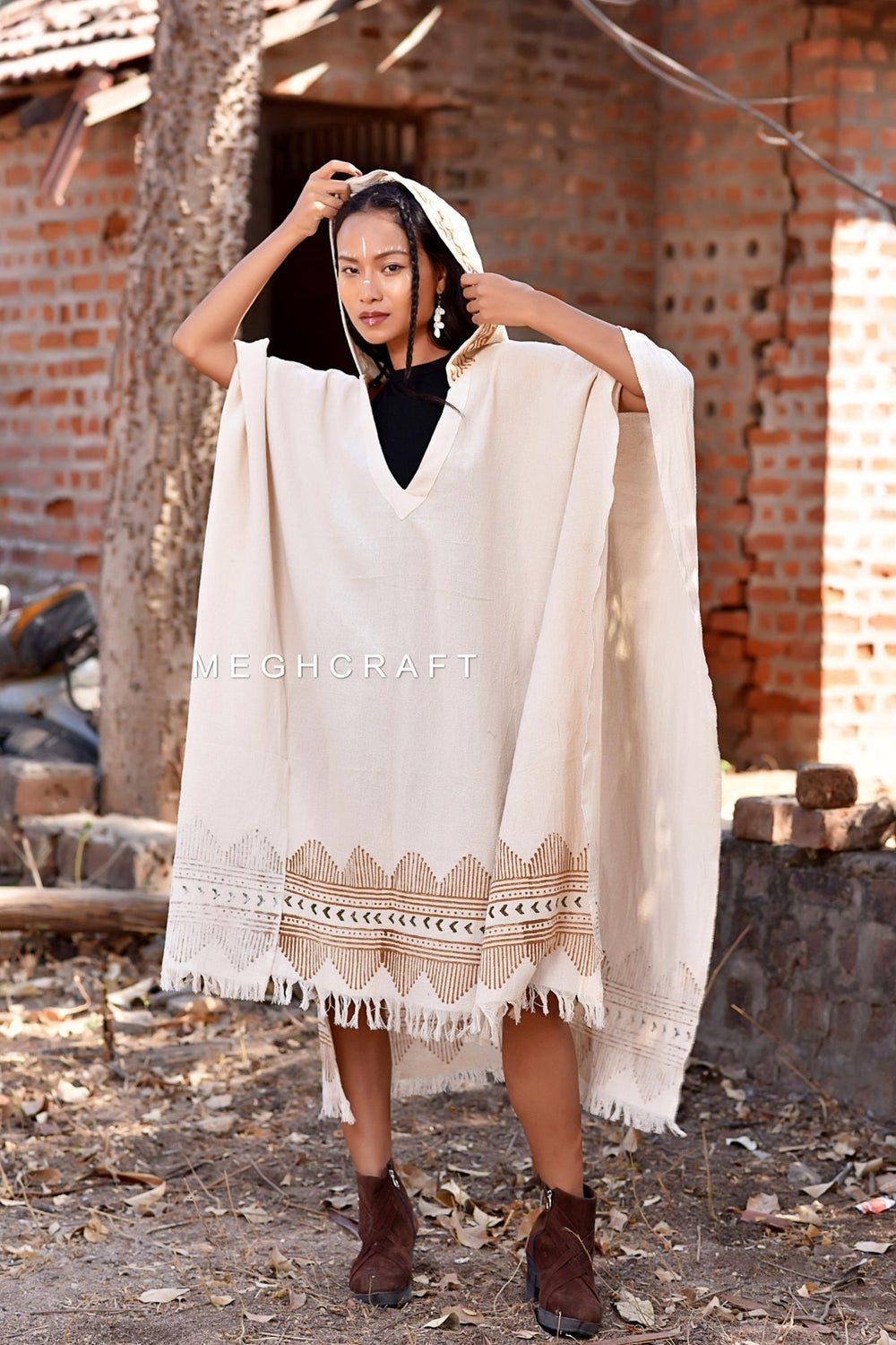 Indian Hemp Cotton Free Size Hoodie Poncho kimono With Block Printed Border.