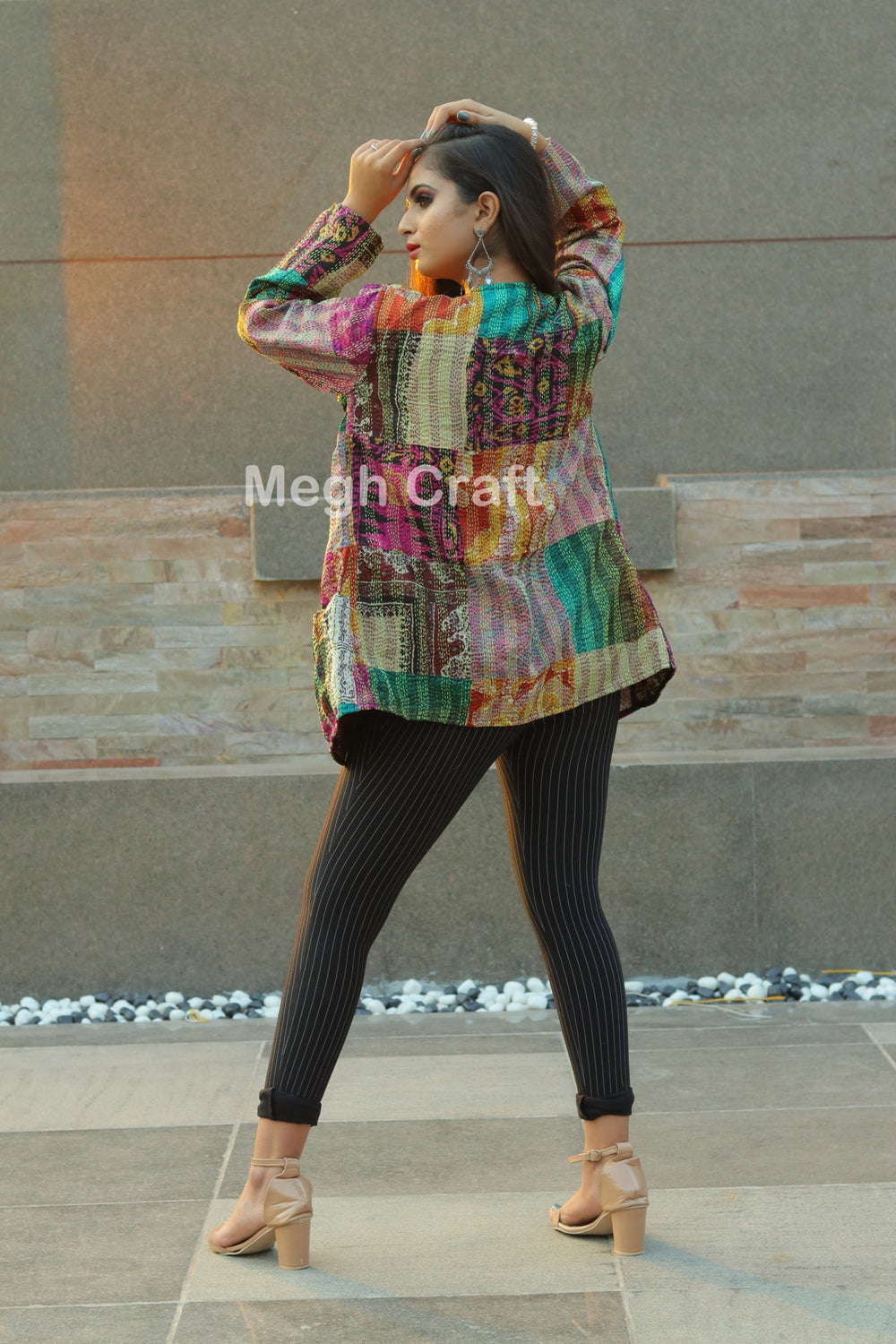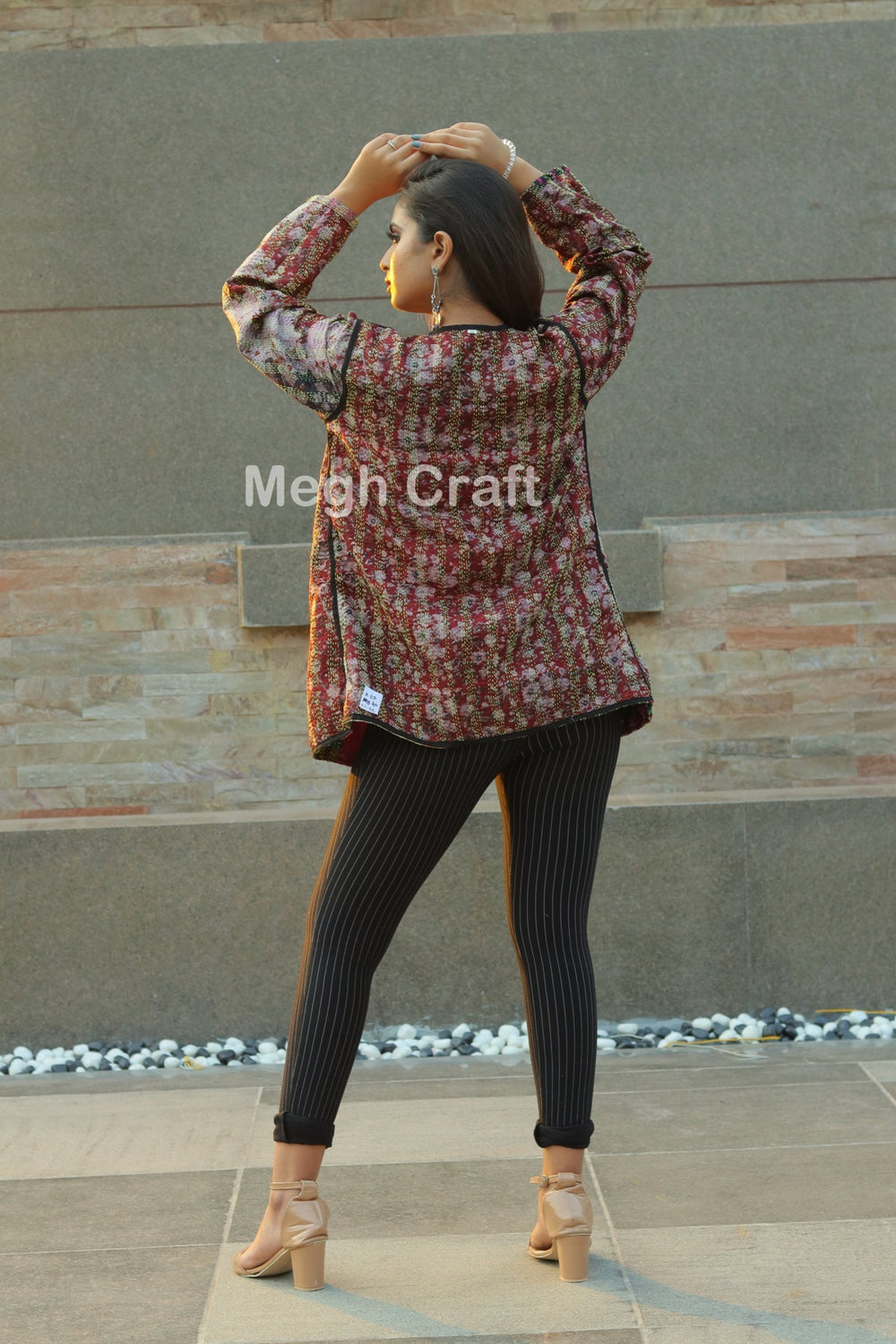 Indian Designer Kantha Handmade Reversible Shrug. Kantha Stylish Reversible handcrafted Waist Coat. Best Suitable for Formal wear, Everyday Wear, Boho Fashion, Bohemian Kantha Jacket.