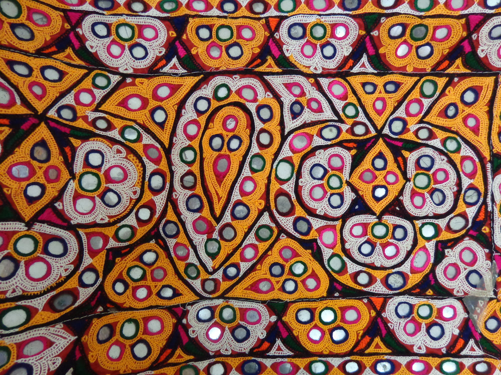 Vintage condition- Original sketch or print mark will show in some places. Some of the material on the flags have frayed or worn. This is an old toran (door hanging) and made by 1960's tribal people so do not expect perfect condition.There is some wear and there are a few stains at the two ends but indeed they do nothing to diminish its beauty.There is some dirt and wear,some small holes from Vintage Material. Some of the mirrors are cracked/burned or are missing. It isn't evident unless you are looking for it; the busy design more than blinds your eye to it.