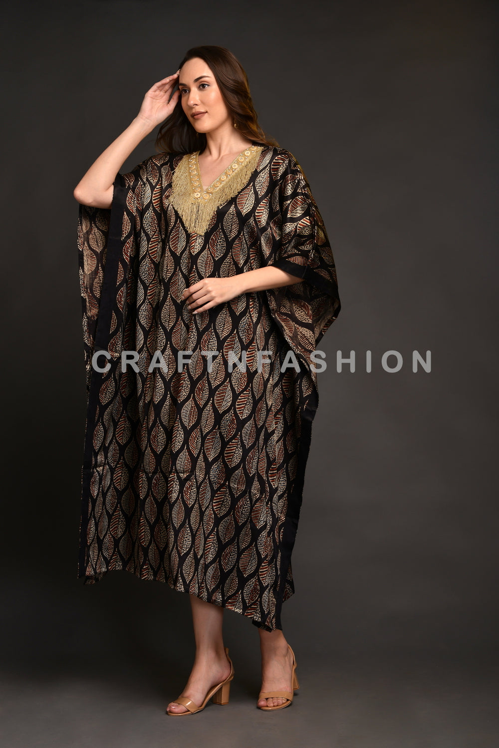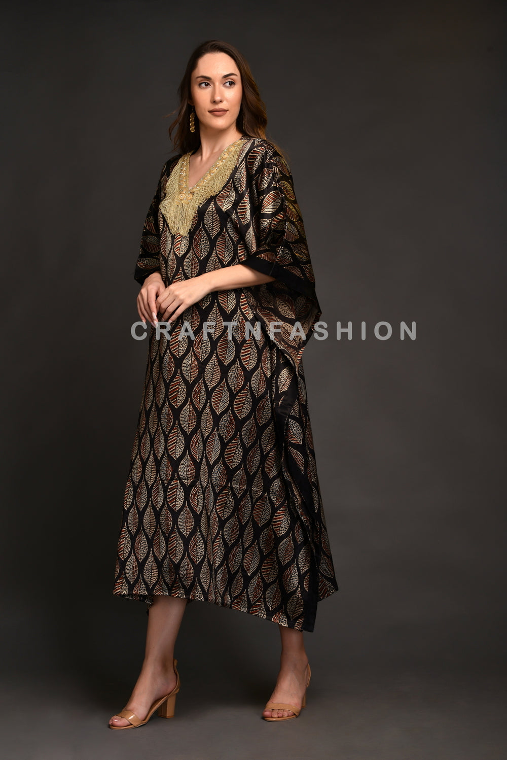 Designer mashru Silk Ajrakh Kaftan Style Beaded Neck Yoke Dress