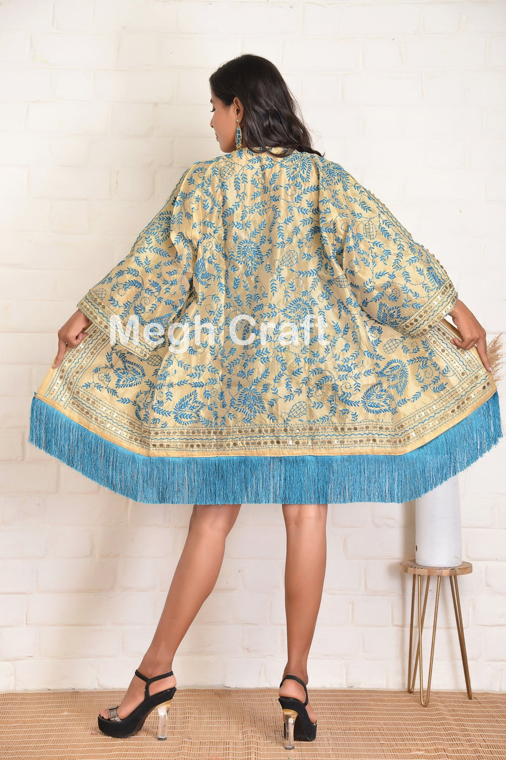 Designer Women Fringe Short Kimono. Indian Chanderi Silk Phulkari Hand work Boho Fashion Fringe Short Kimono Robe. Embroidered Boho Style Beach wear Body Cover Up. Fringe Kimono. Best Suitable For Beach Wear, Fusion Wear, Fashion Wear, Traditional Wear