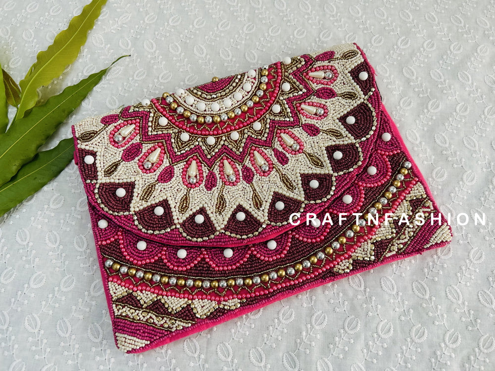 Pink Jute Boho clutch Bag, Exclusive Boho Fashion Jute Clutch Handbag. This is an authentic Hand embroidered, Beaded Clutch with chain crossbody strap