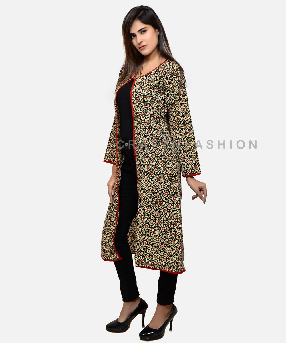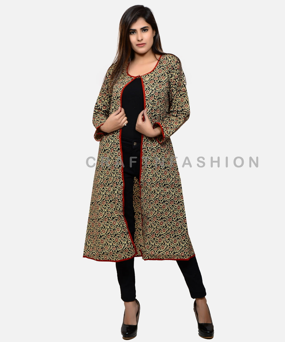 Indian Designer Ajrakh Printed Summer Fashion Long Shrug. Cotton hand bloack Printed Ajrakh / Gamthi Print Long Shrug, jacket. Best Suitable for Formal wear, Everyday Wear, Summer Fashion, Boho Fashion.