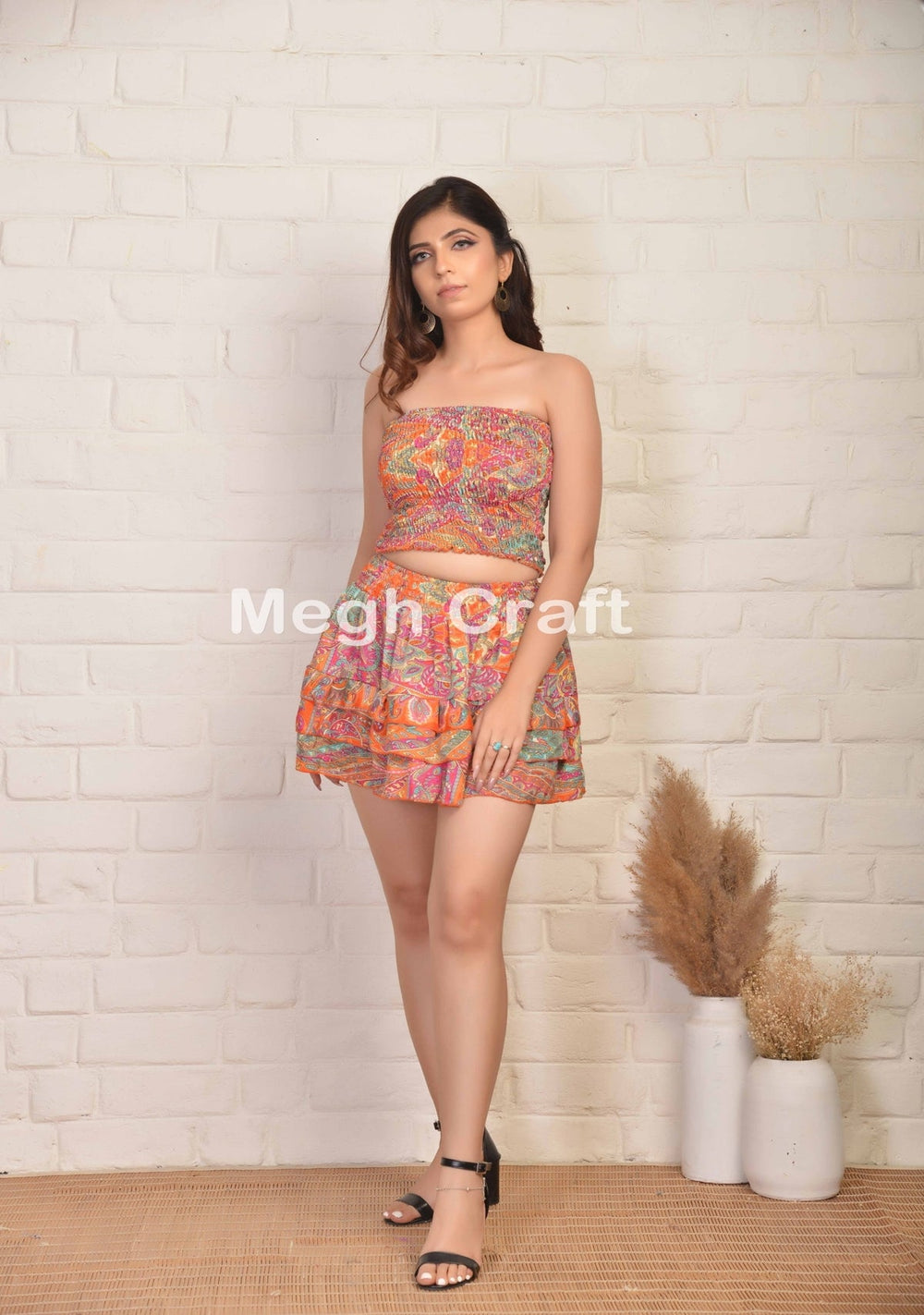 Boho Fashion Silk Smocked Crop Top With Matching Mini Skirt Set.