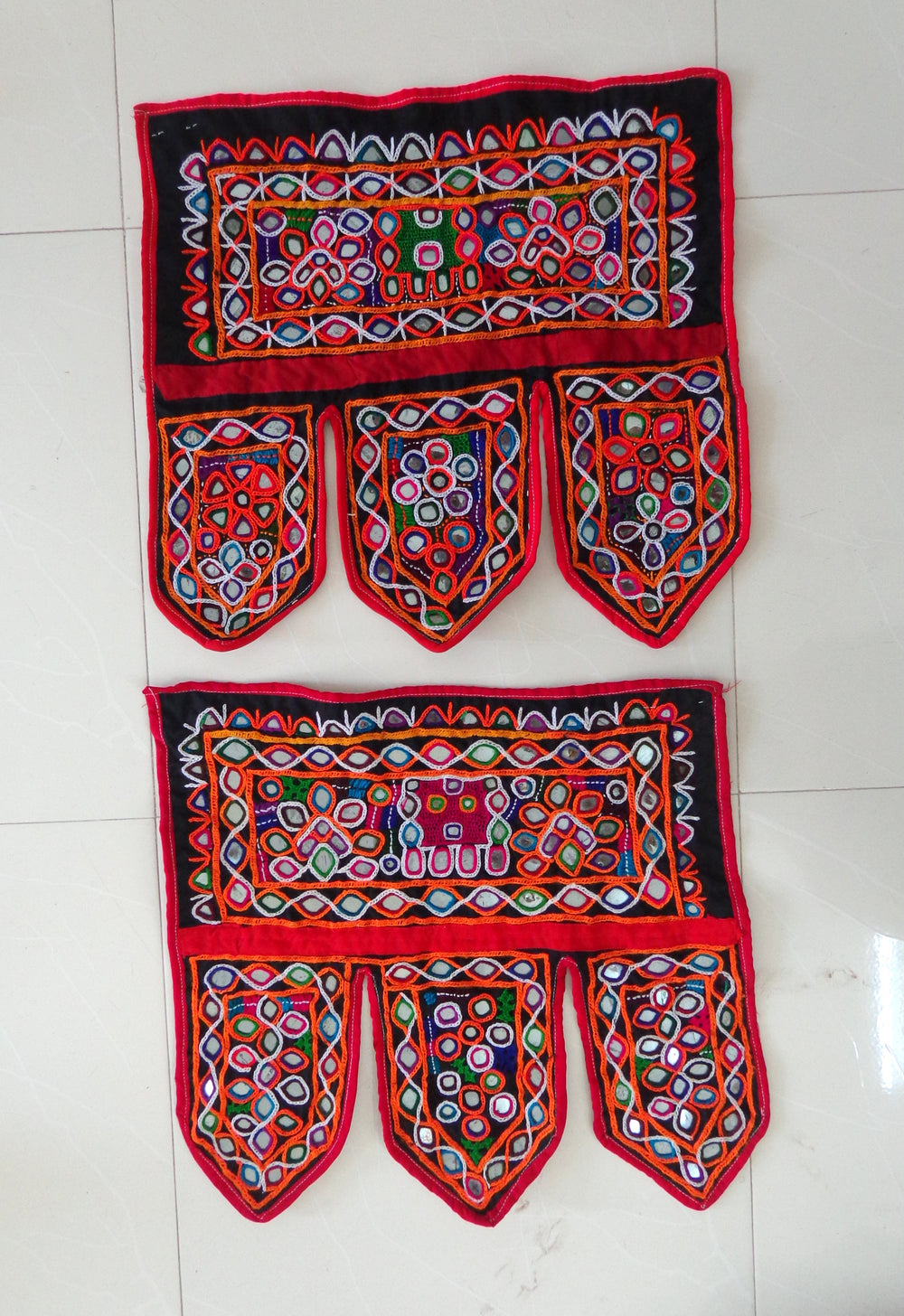 Vintage condition- Original sketch or print mark will show in some places. Some of the material on the flags have frayed or worn. This is an old toran (door hanging) and made by 1960's tribal people so do not expect perfect condition.There is some wear and there are a few stains at the two ends but indeed they do nothing to diminish its beauty.There is some dirt and wear,some small holes from Vintage Material. Some of the mirrors are cracked/burned or are missing. It isn't evident unless you are looking for it; the busy design more than blinds your eye to it.