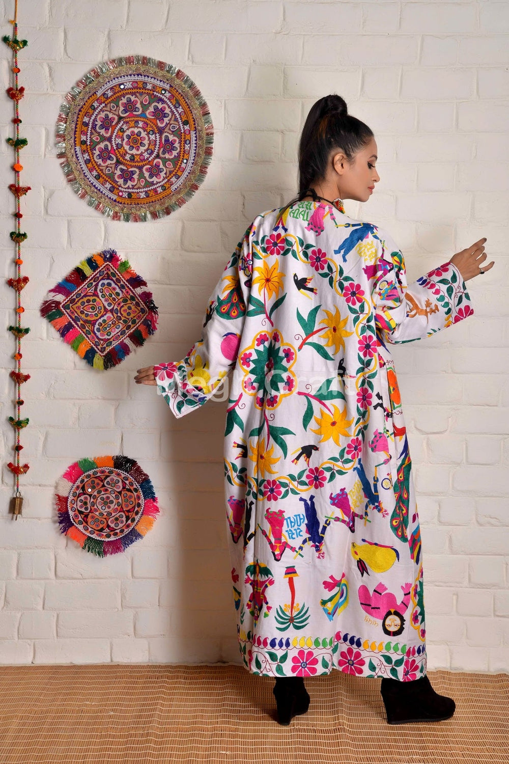 Indian Gujarati Peacock and Animal Motif Hand Embroidery Long Jacket Kimono Coat.