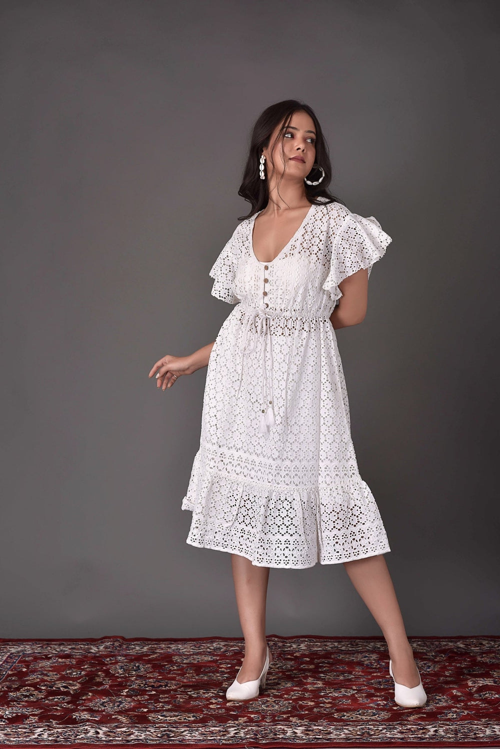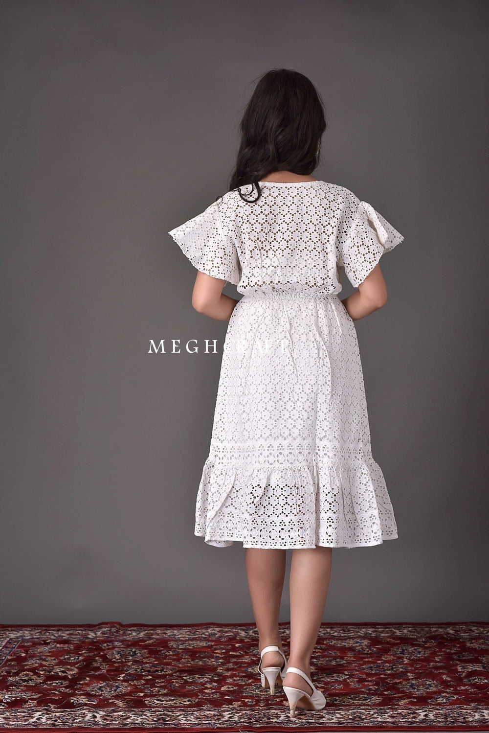 Designer Schiffli Embroidered Cutwork Midi Dress. Best Suitable for summer wear ,beach wear ,wedding wear, bridesmaid's dresses & fashion wear.