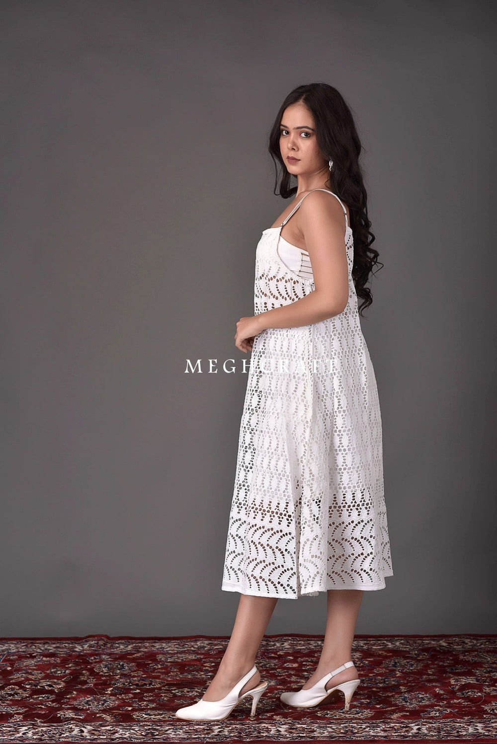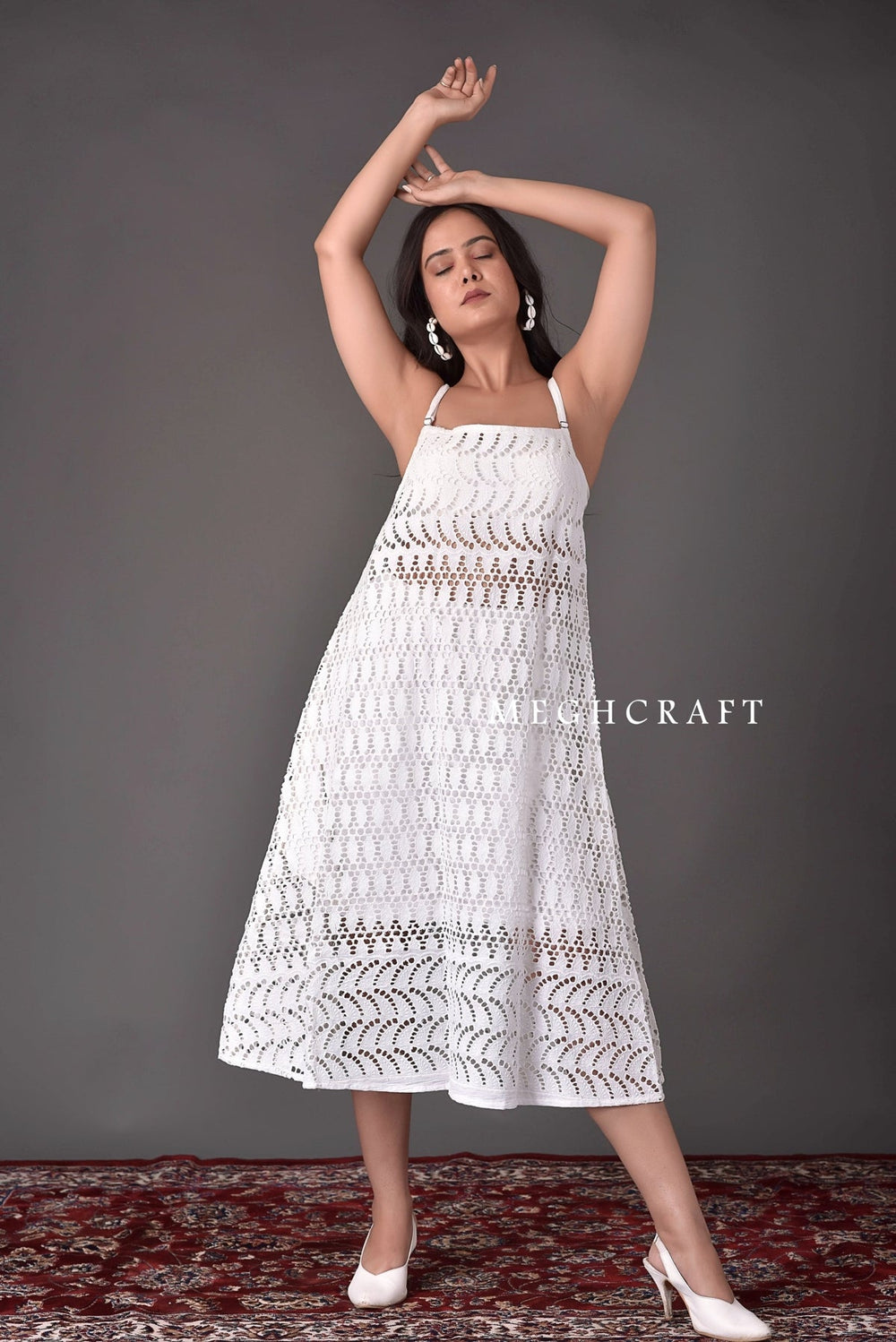 Designer Schiffli Embroidered Cutwork Midi Dress. Best Suitable for summer wear ,beach wear ,wedding wear, bridesmaid's dresses & fashion wear.