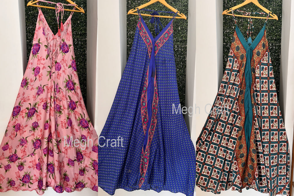 Designer Exclusive Indian Recycled Silk Sari made Boho Beach Party Wear Halter Neck Maxi Dress will enhance your beauty.