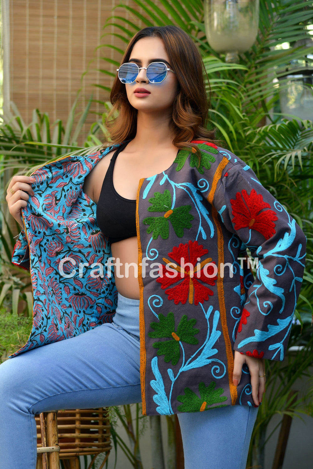 Floral, Paisley, Vector Thread Embroidery Suzani Kimono Coat Jacket Crafted By Skilled Indian Artisan Having both the Side Embroidery Work with Bright & Eye catchy Look. The Traditional embroidery patterns will make you look Trendy & beautiful.