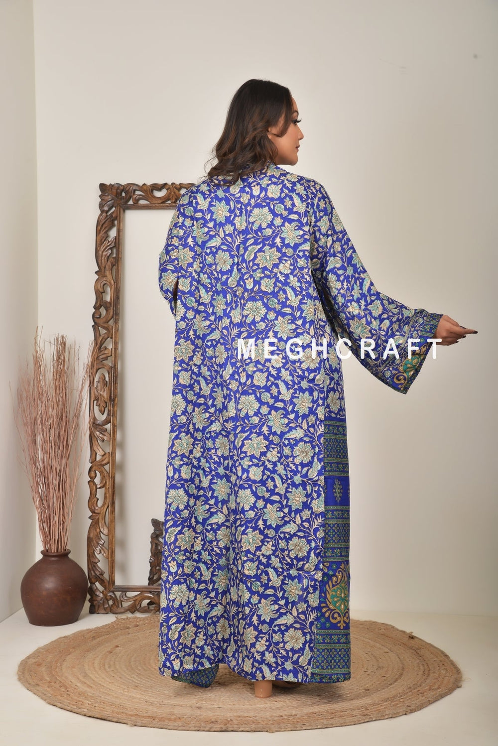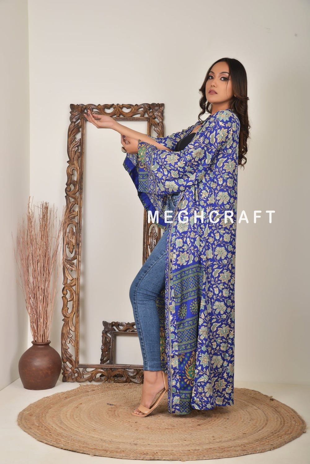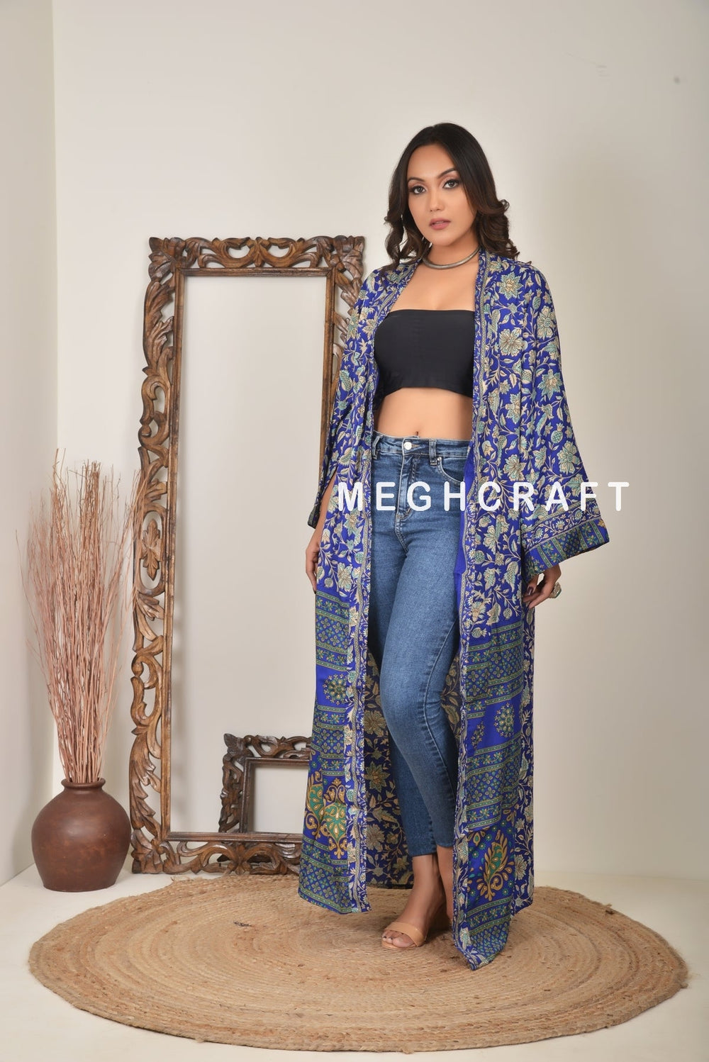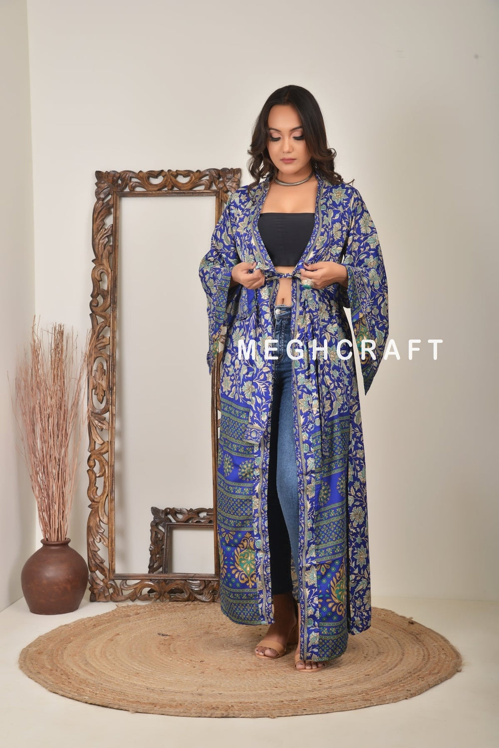 Designer Bohemian Floral Beach Wear Silk Kimono Robe with Belt / Body Cover-up . Long ,Loose Fit, Soft & Comfy. Best suitable as Beach wear, Bikini Cover up, Swimsuit, Bathrobe, Summer Cardigan, Sleepwear & Resort wear.