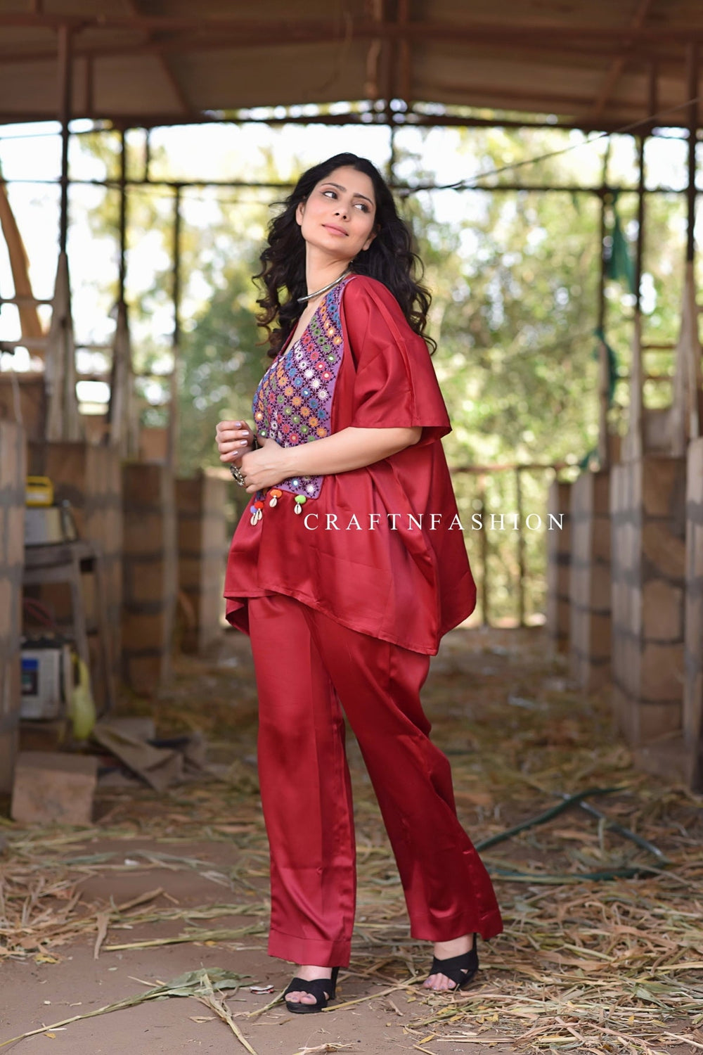 Designer Exclusive Indian Traditional wear Bohemian silk Kaftan Co-ord Set, Indian Vintage Mirror Embroidered Neck yoke Kaftan Top Pant SetBest suitable for Boho Gypsy style , Bohemian Fashion wear , Festival wear & Fashion wear.